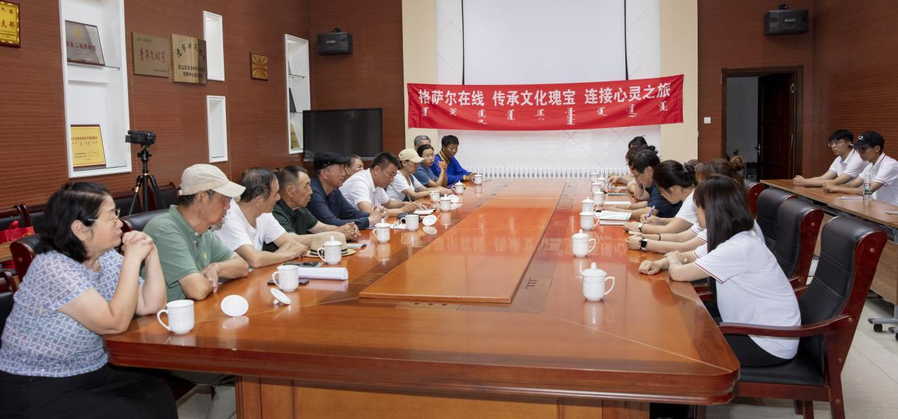 完成对巴林右旗多处非遗的深入调研后,与巴林右旗文化旅游体育局、非遗协会、博物馆、非遗传承人进行了一场以“格斯尔在线传承文化瑰宝连接心灵之旅”为主题的总结座谈会。巴林右旗文化旅游体育局副局长布仁巴音、非遗保护协会会长钱德海、博物馆副馆长海棠、非遗传承人、学院师生等参与本次座谈,会议由巴林右旗文体局副局长布仁巴音主持。双方一致认为,巴林右文化底蕴丰厚,文化要素特别是非遗要素在赋能产业转型升级中具有独特优势,可以将其融入产品设计、品牌塑造、市场营销等各个环节,提升产品的文化内涵和附加值。