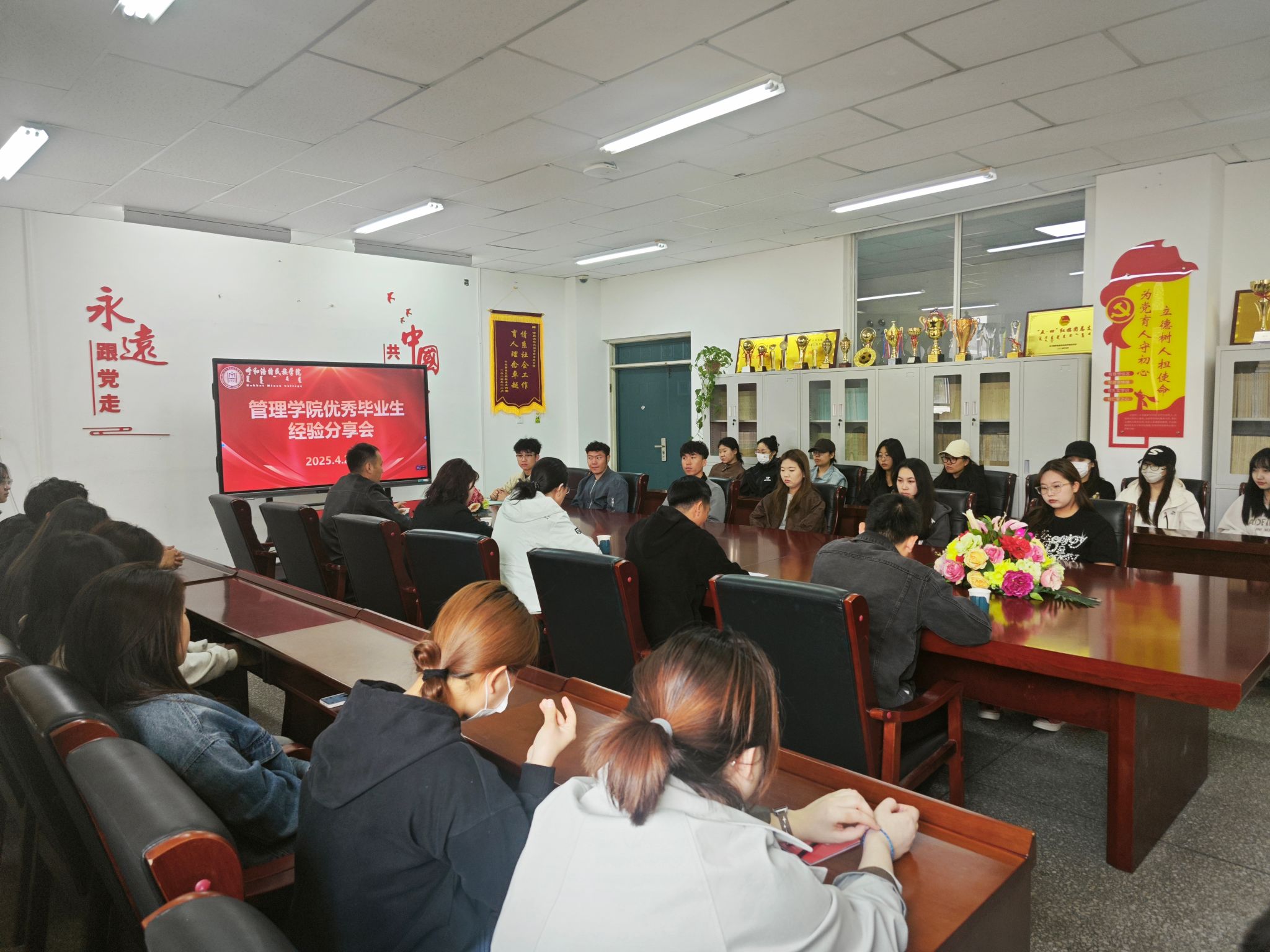 4月26日上午,管理学院在尚智楼112会议室举办优秀毕业生经验分享会。现就职于中储粮内蒙古分公司的优秀毕业生代表王慧敏受邀参会,为学弟学妹们分享成长经验。
