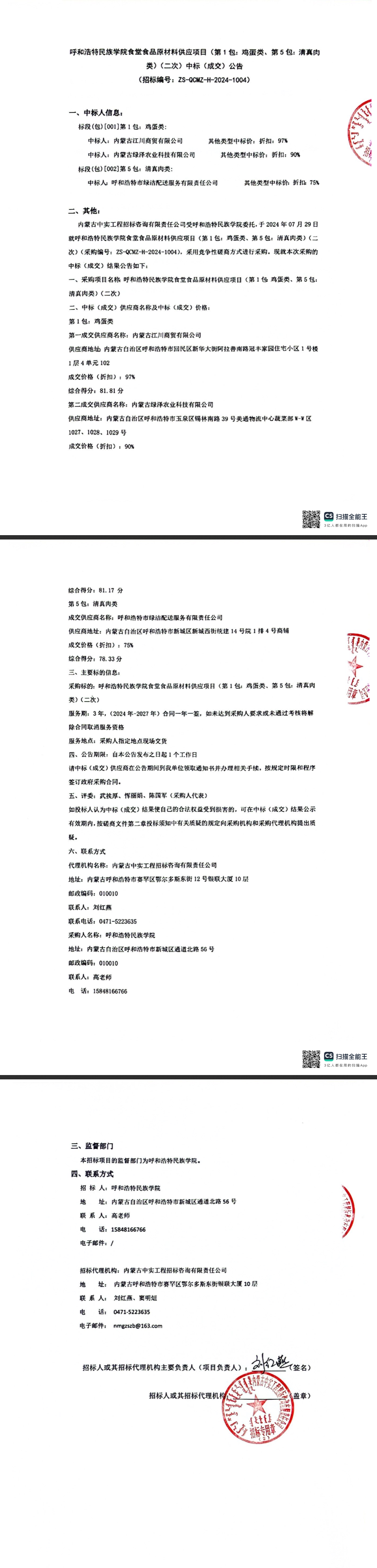 MILE米乐集团食堂食品原材料供应项目(第1包:鸡蛋类、第5包:清真肉类)(二次)中标(成交)公告