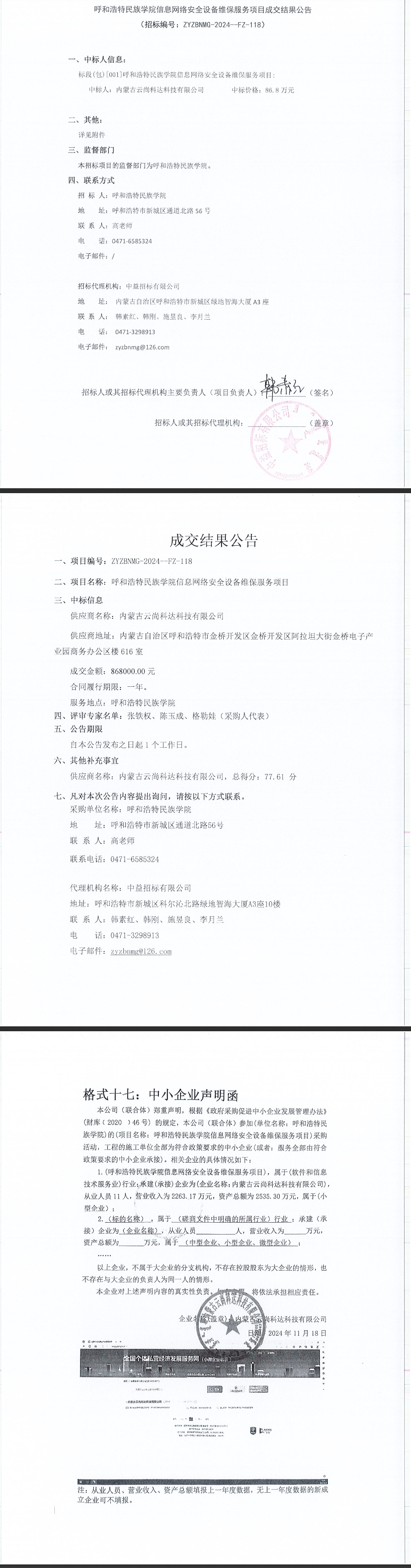 呼和浩特市民族学院2024年信息系统等保测评项目中标结果公示