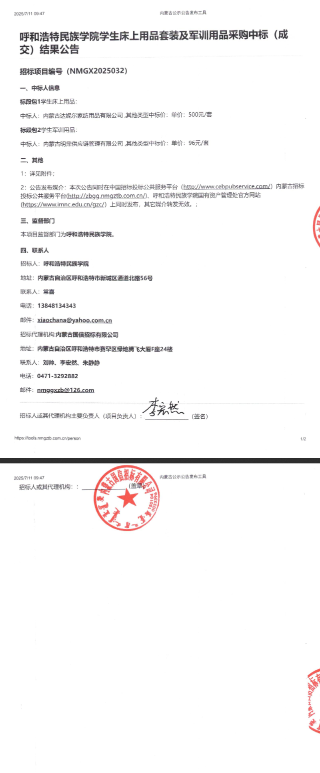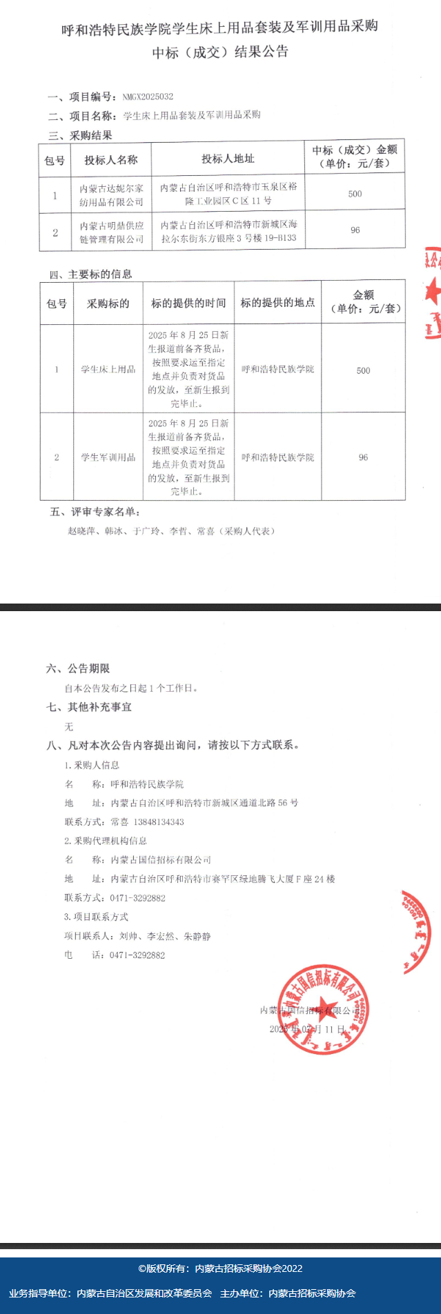 MILE米乐集团学生床上用品套装及军训用品采购中标(成交)结果公告