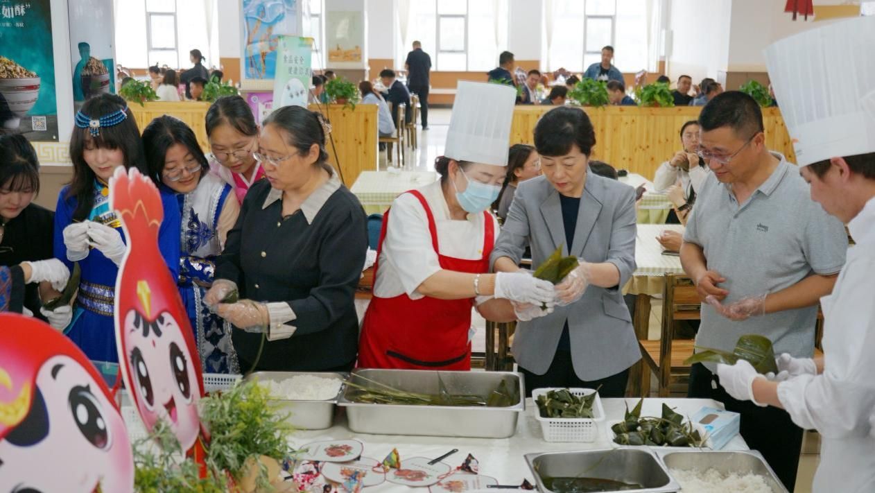 端午节是中国首个入选联合国教科文组织《人类非物质文化遗产代表作名录》的传统节日。为深入学习贯彻习近平总书记关于弘扬中华优秀传统文化的重要指示精神,在民族政策宣传月深入开展之际,5月30日中午,学校党委统战部、学生工作部、后勤管理处邀请呼市文化艺术研究院(非遗中心),联合开展“非遗润北疆·浓情过端午”主题活动。校领导刘九万、王敏、格根哈斯、王冬梅、高喜天、刘瑞鸿、额尔敦布和、双虎出席,相关部门负责人、师生代表共50余人参加活动。