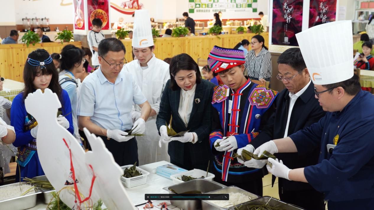 活动现场,非遗传承人、新东方烹饪集团高级主讲教师崔伟现场向师生传授制作技艺。崔伟从选料、浸米、煮叶、折粽叶、填糯米、放馅料、扎粽绳、煮粽子等方面讲授制作工序。校领导与汉族、蒙古族、锡伯族、瑶族、布依族等20个民族师生围在一起同包粽子,互帮互学,学习端午节文化,感受中华民族优秀传统文化的魅力,现场气氛温馨。