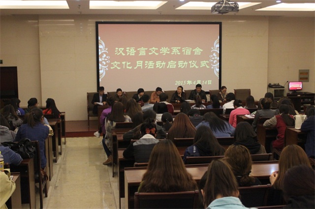 为深入开展宿舍文化月活动,汉语言文学系于2015年4月14日在学院图书馆一楼报告厅举办了汉文系宿舍文化月活动启动仪式。学生处副调研员张玉梅、系党总支书记赛音图、系主任崔凤珍、系副主任哈琴、各班主任及全体学生参加。会议由系团总支副书记张子涵主持。