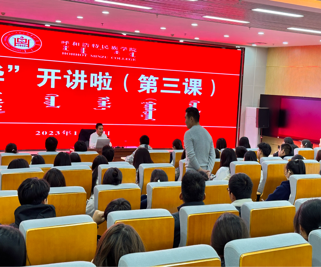 文学院辅导员宝力尔及文学院150余名学生聆听宣讲报告