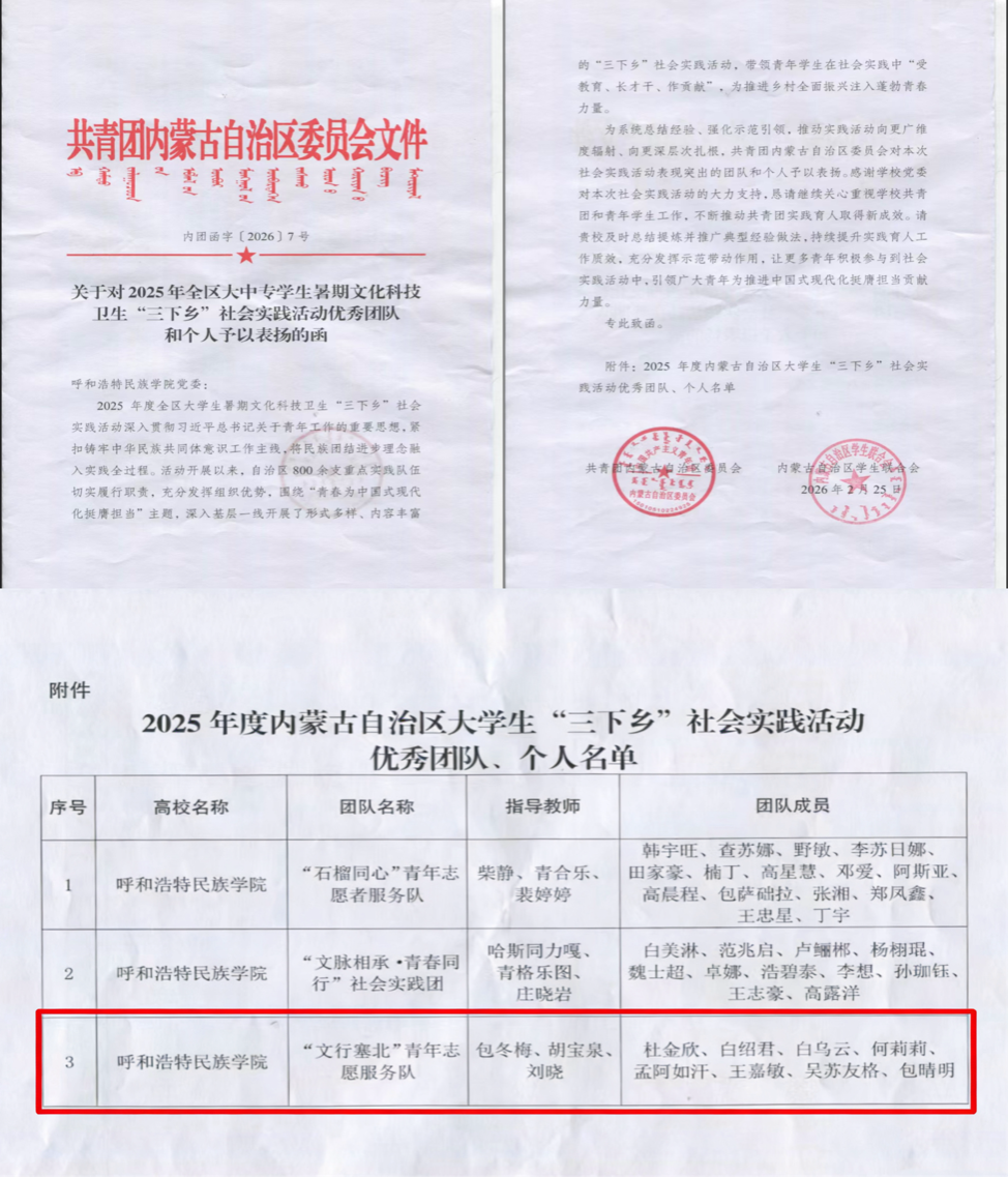 热烈祝贺MILE米乐集团文学院“文行塞北”青年志愿者服务队荣获2025年度内蒙古自治区大学生“三下乡”社会实践活动优秀团队称号!