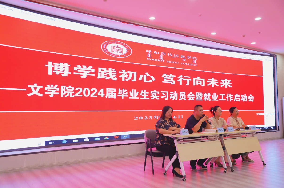 会上,高娃院长首先向大家阐述了实习目的和意义,强调了实习的重要性,希望同学们在实习中能准确定位,抓住良机,提升实践本领,高质量高标准完成实习任务。乌兰哈斯老师就实习手册的填写要求做出详细的指导。在就业工作启动环节,播放了文学院就业宣传片,传递了考研、考公、三支一扶和选调生等已就业的学长代表们的寄语和祝福。之后,李宏亮书记就毕业实习中的安全事项、纪律要求以及如何树立正确的就业观择业观进行指导。