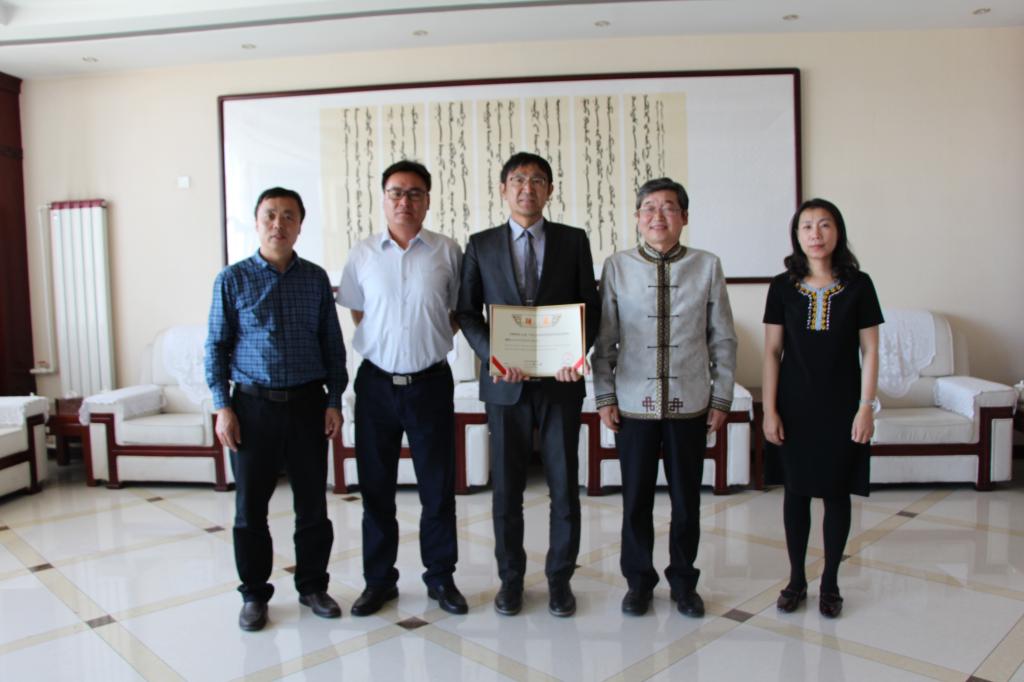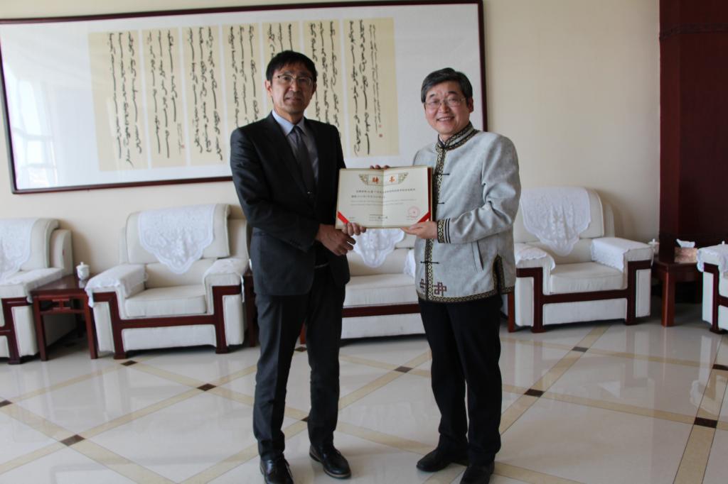 阿拉坦仓副校长向杉山喜一教授颁发聘书
