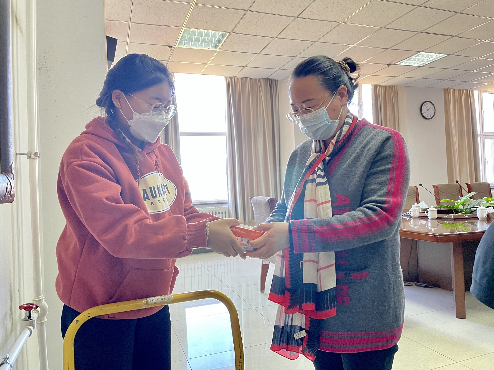 会后,公寓管理中心工作人员以宿舍为单位发放了体温计。