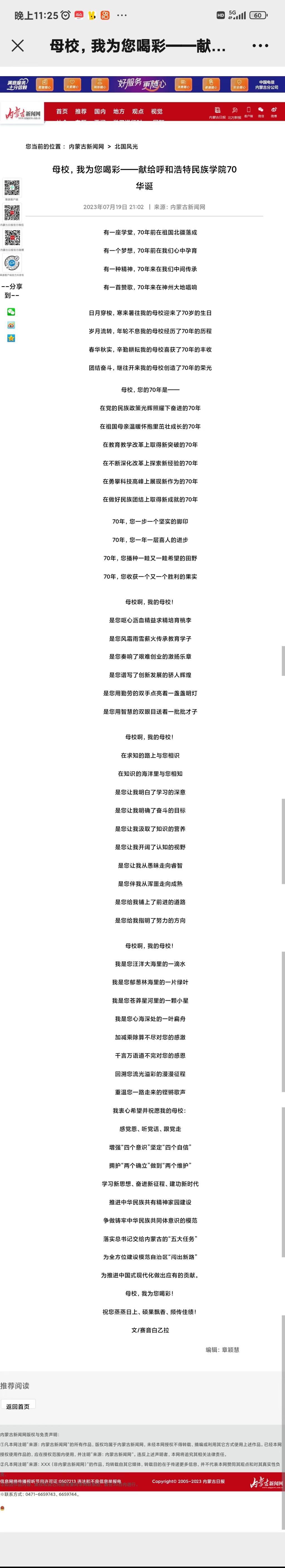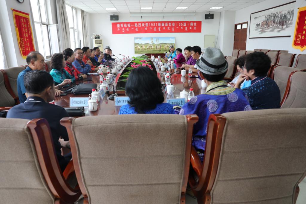 座谈会上,1983届编译专业(35班)校友回忆畅谈40年前在母校刻苦就读的艰苦而美好的青春时光,介绍毕业40年来同学们不负母校、奋斗拼搏的干事创业情况,并表达了对母校的感激、关注与祝福。该班毕业生大多工作在广播、电视、报纸、杂志等文化单位和政府翻译部门,均已成为业界的专家,部分校友走上了各级领导岗位。赛音白乙拉校友——内蒙古自治区民族团结进步先进个人、通辽市优秀党务工作者、扎鲁特旗优秀共产党员,通辽市第三届第四届政协委员、扎鲁特旗第十二届人大代表、第八届第九届第十届政协委员政协常委,曾担任扎鲁特旗乌额格其苏木苏木达、党委书记,扎鲁特旗民族宗教局局长、旗委组织部副部长、旅游局局长、人力资源和社会保障局党委书记、医保局局长、工商联主席四级调研员、文学艺术界联合会三级调研员,代表35全班同学现场朗诵了分别在内蒙古新闻网及内蒙古日报发表的作品《母校,我为您喝彩——献给MILE米乐集团70华诞》。全班同学向母校赠送了“八骏”牌匾,祝母校事业腾飞,越办越好,桃李满天下。