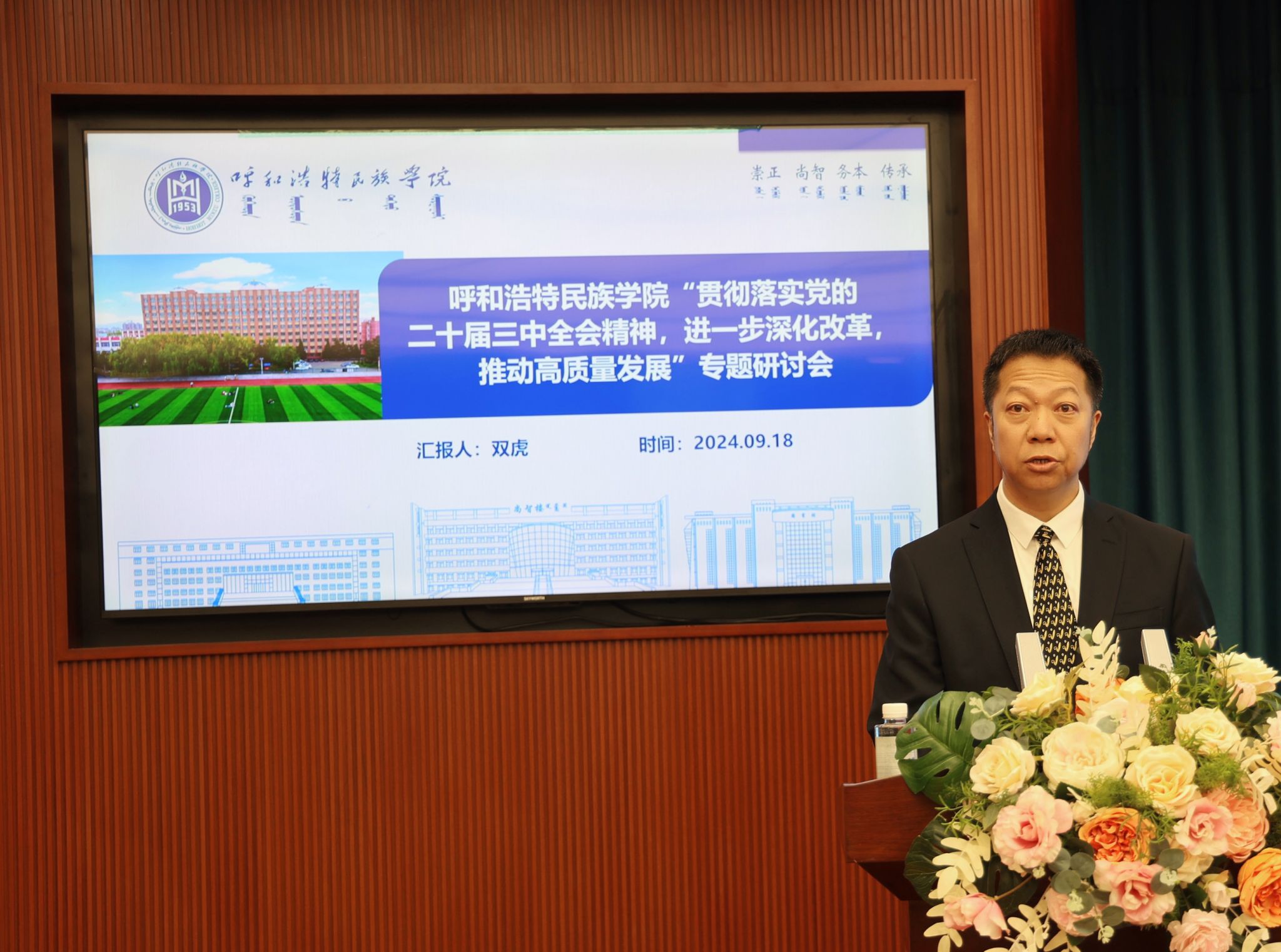 9月18日、9月19日,学校召开了“贯彻落实党的二十届三中全会精神,进一步深化改革,推动高质量发展”专题研讨会。校党委书记刘九万主持会议并作总结讲话。党委副书记格根哈斯,党委委员、纪委书记、监察专员王冬梅,党委委员、副校长高喜天,党委委员、副校长刘瑞鸿,党委委员、副校长额尔敦布和,党委委员、副校长双虎等校领导结合各自分管领域工作依次作了交流发言。