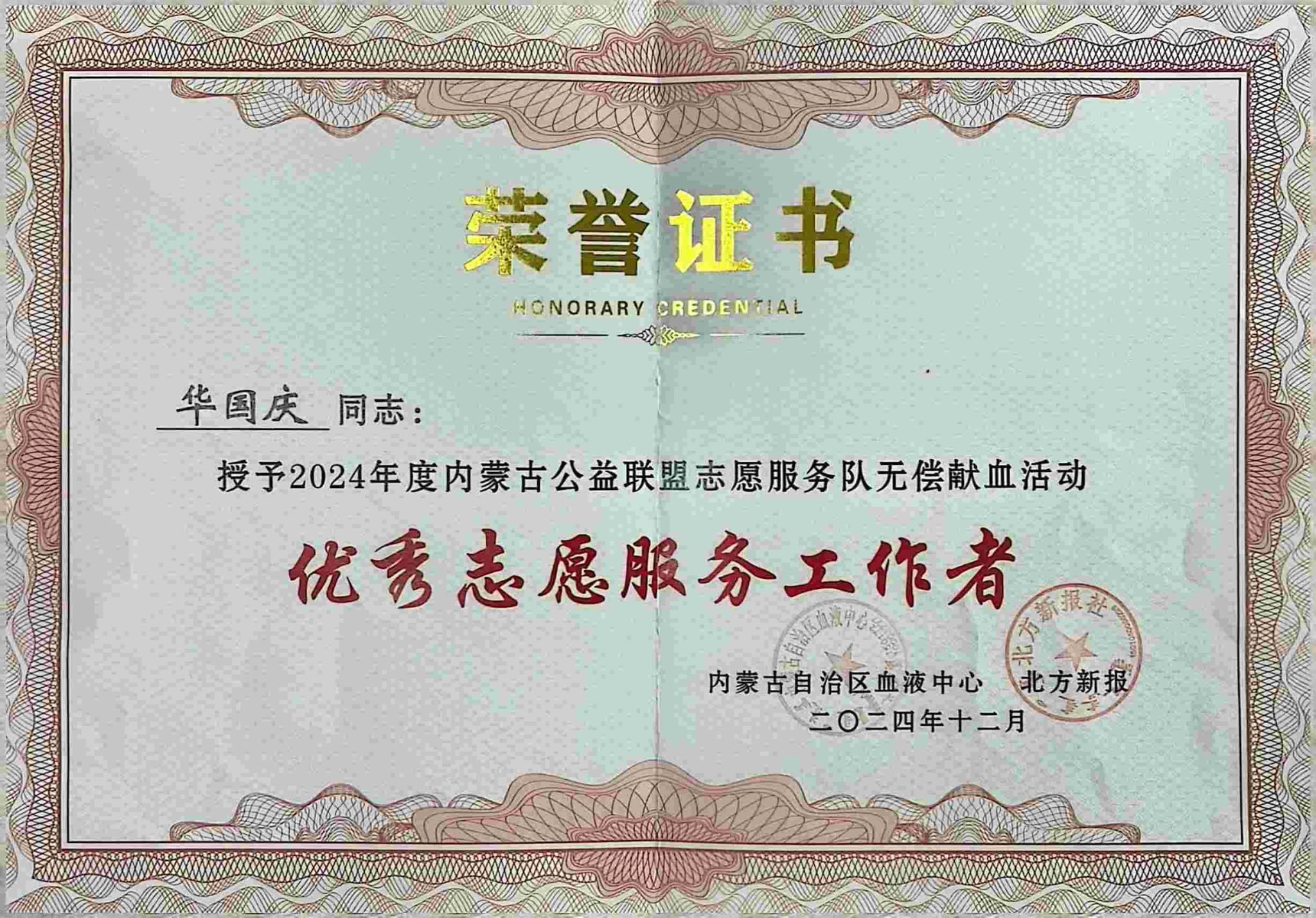 近日,商学院志愿服务队、指导教师华国庆在2024年度内蒙古公益联盟志愿服务队无偿献血活动中表现优异,荣获“优秀志愿服务组织”及“优秀志愿服务工作者”称号。