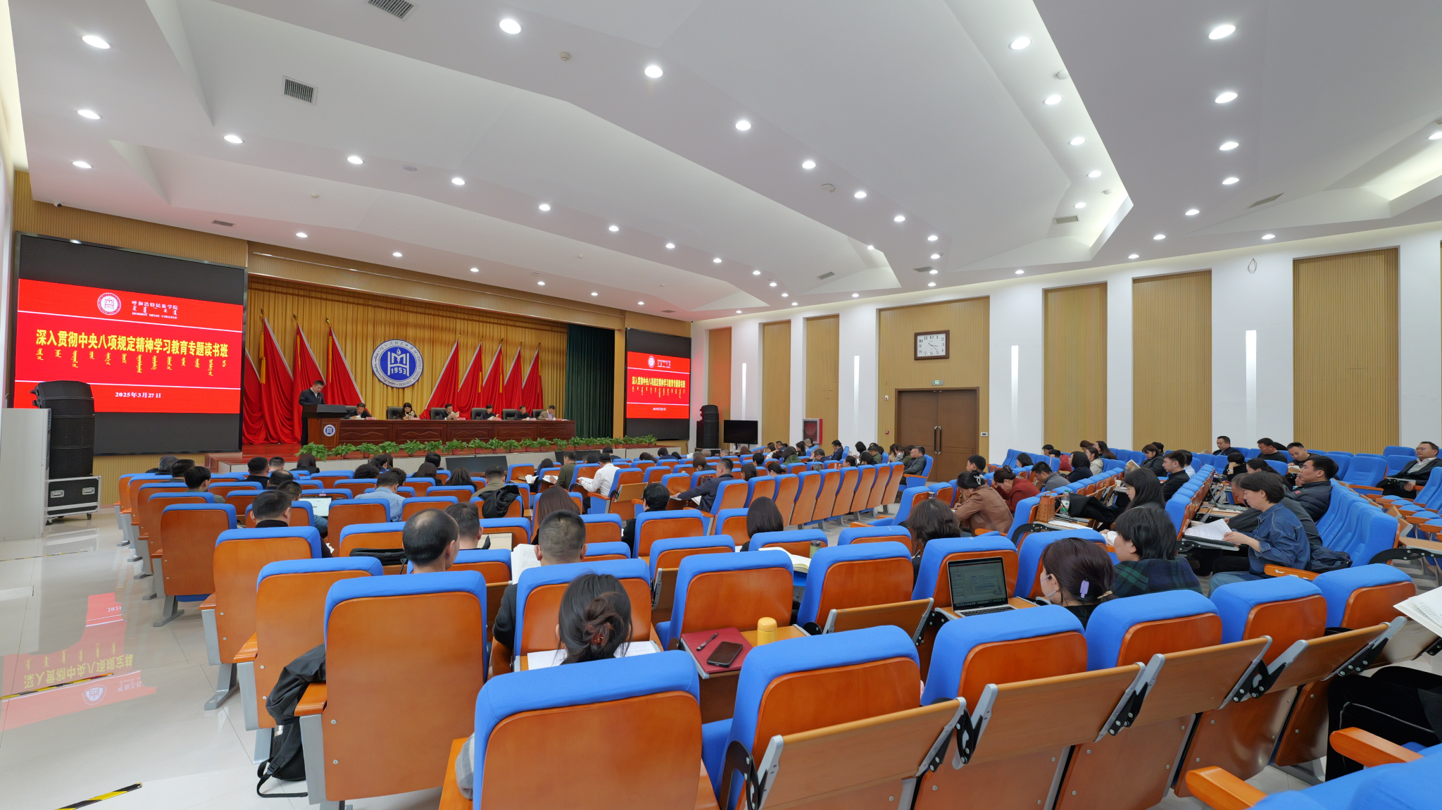 3月26日—27日,学校党委举办深入贯彻中央八项规定精神学习教育读书班。校党委书记刘九万作读书班开班动员讲话,并以党委理论学习中心组(扩大)学习形式讲授了专题党课。校党委副书记、校长王敏作读书班结班讲话。校党委副书记格根哈斯主持。校党委委员、纪委书记、监察专员王冬梅以“八项规定 改变中国”为题作了专题纪律党课。全体校领导、处级干部、党支部书记、教研室主任参加。