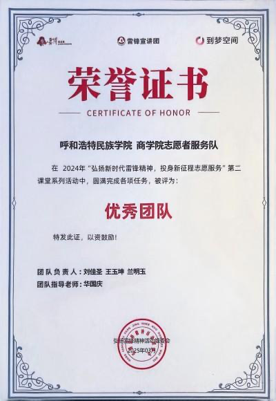 近日,在“弘扬新时代雷锋精神,投身新征程志愿服务”第二课堂系列活动中,米乐官网商学院“雷锋精神志愿服务团”出色完成各项实践任务,被评为全国“优秀团队”。