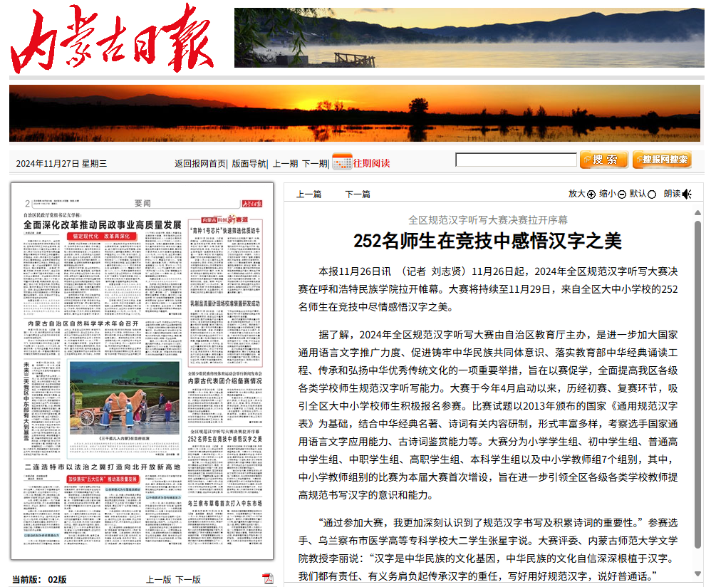 突出以文育人,厚植文化底蕴。开展“三笔字”、演讲比赛、师范生技能大赛、经典诗文诵读、汉听大赛等活动,在文化浸润中提升文化内涵。近年,学生在国家和自治区级学科竞赛中屡获佳绩;1名学生入选内蒙古作家协会会员,出版长篇小说并获“萌芽计划”第三届全国大学生网络小说大赛优秀奖,同时创作2部微电影剧本、在“快点”APP发布6部对话小说,展现出扎实的文学创作功底与综合素养。