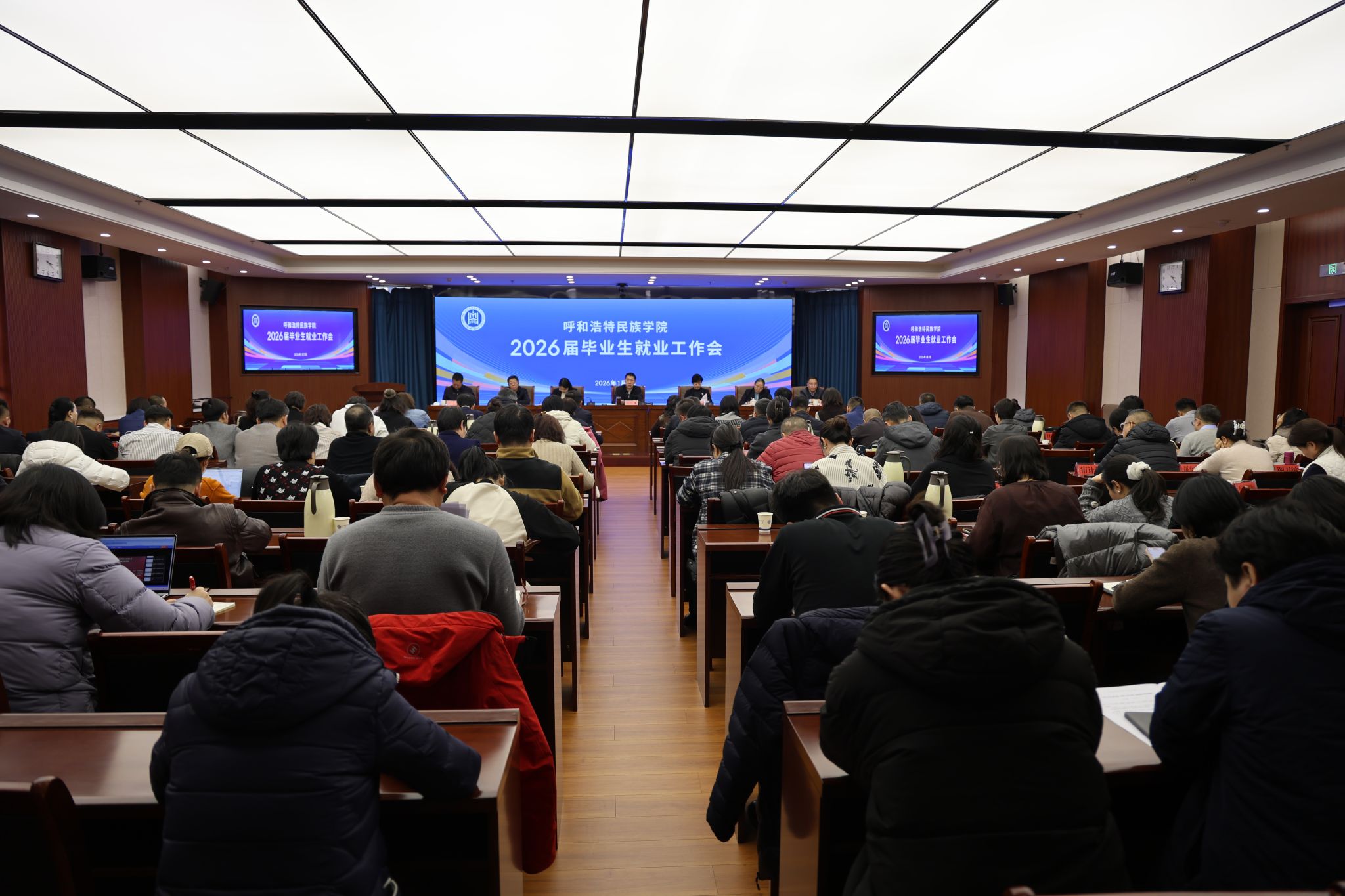 为深入贯彻落实教育部及自治区教育厅关于做好2026届高校毕业生就业创业工作的决策部署,全面推进米乐官网2026届毕业生高质量充分就业,1月7日,学校召开2026届毕业生就业工作会。校党委书记刘九万出席会议并讲话,党委副书记、校长王敏,党委副书记格根哈斯,党委委员、纪委书记、监察专员王冬梅,党委委员、副校长高喜天,党委委员、副校长刘瑞鸿出席会议。会议由党委委员、副校长双虎主持。