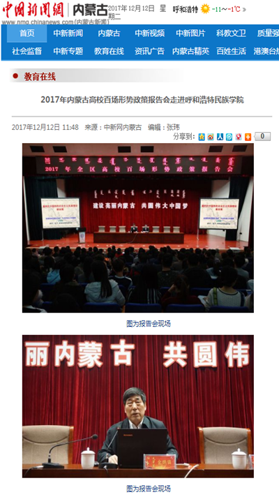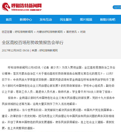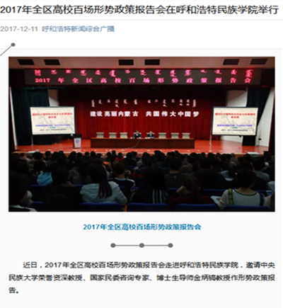 12月7日下午,中央民族大学金炳镐教授应邀来米乐官网作形势政策报告,这是米乐官网“2017年全区高校百场形势政策报告会”系列活动之一。经宣传部向媒体推荐,《内蒙古日报》(蒙文版)、中国新闻网、呼和浩特新闻网、呼和浩特新闻综合广播对此次活动进行了报道,并有其他媒体进行转载报道。