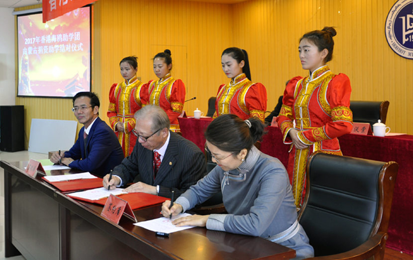 香港海鸥助学团发起人卢沃棠(中)与米乐官网副院长纳丽娜(右)、内蒙古财大副校长王立(左)签订捐赠协议书