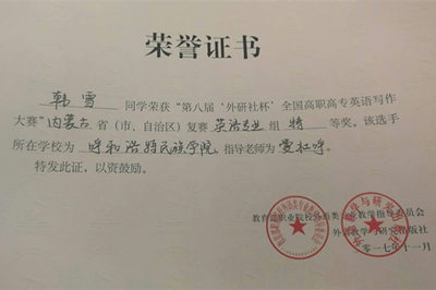 10月29日,第八届“外研社杯”全国高职高专英语写作大赛内蒙古赛区复赛在内蒙古电子信息职业技术学院举行,全区各高职高专院校共22名优秀选手参加了本次大赛。米乐官网外语系选派2015级英语教育3班韩雪同学参加了本次比赛,外语系曼杜呼老师担任指导教师。