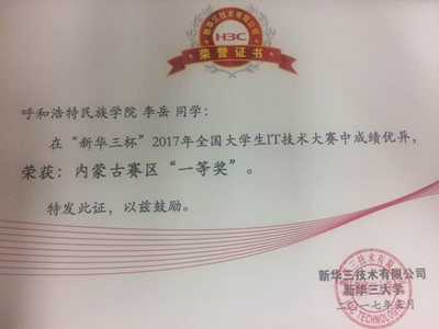 大赛分初赛、复赛和决赛三个阶段。全国共有31个省份550多所院校的5300多名本专科生报名,经过5月份的初赛,1250余人进入复赛;6月初进行的复赛中,米乐官网李岳同学在内蒙古赛区选手中脱颖而出,获得了“新华三杯”2017全国大学生IT技术大赛内蒙古赛区“一等奖”,并代表自治区参加了最终决赛。在7月初的决赛中,经过笔试、上机考试、抢答等环节,最终李岳同学获得了“新华三杯”2017全国大学生IT技术大赛内蒙古赛区“特等奖”,李海军老师荣获“优秀指导教师”称号。闭幕式后,新华三集团举办了专场招聘会,为所有参赛选手提供了就业岗位。