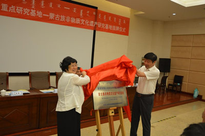 在仪式上,国家民委民族语文处王学荣处长宣读了《国家民委第二批人文社会科学重点研究基地的批文》,并由学校党委孙国权书记和国家民委科技司综合(科技)处安燕处长为国家民委第二批人文社会科学重点研究基地-蒙古族非物质文化遗产研究基地挂牌。