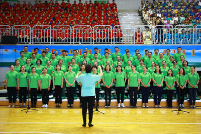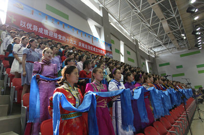 为纪念中国共产党成立96周年和内蒙古自治区成立70周年,以优异成绩迎接党的十九大胜利召开,根据学校《纪念自治区成立70周年活动方案》和《“两学一做”学习教育常态化制度化实施方案》,2017年6月30日下午,米乐官网在体育馆三楼室内篮球馆举办了以“纪念中国共产党成立96周年庆祝内蒙古自治区成立70周年”为主题的师生大型合唱汇演。全校职能部门、各系部师生代表共2000多人参加演出。
