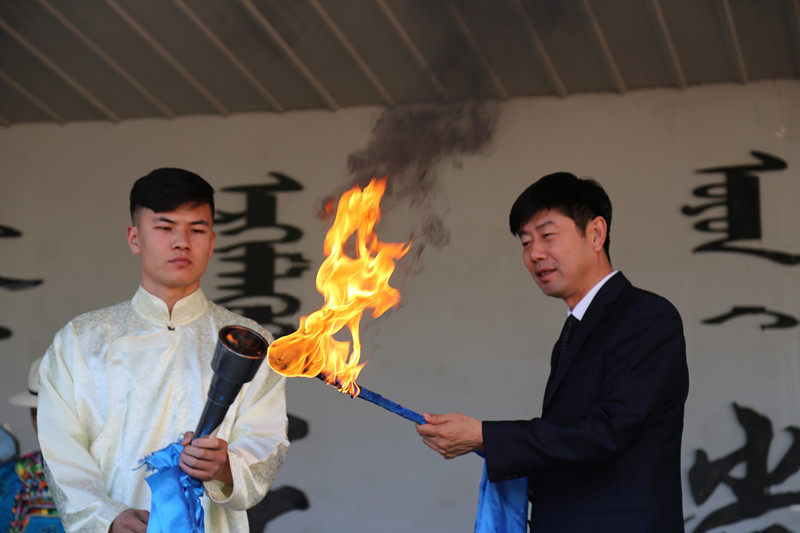接着,举行火炬接力与祭火仪式。由孙国权书记点燃火炬,各系火炬手接力传递,随后点燃圣火盆,并由格日乐图院长祭旺圣火。