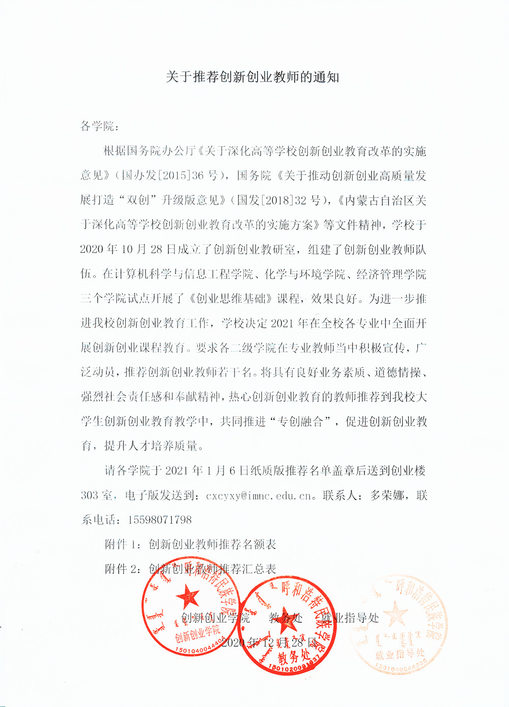 附件1: 创新创业教师推荐名额表