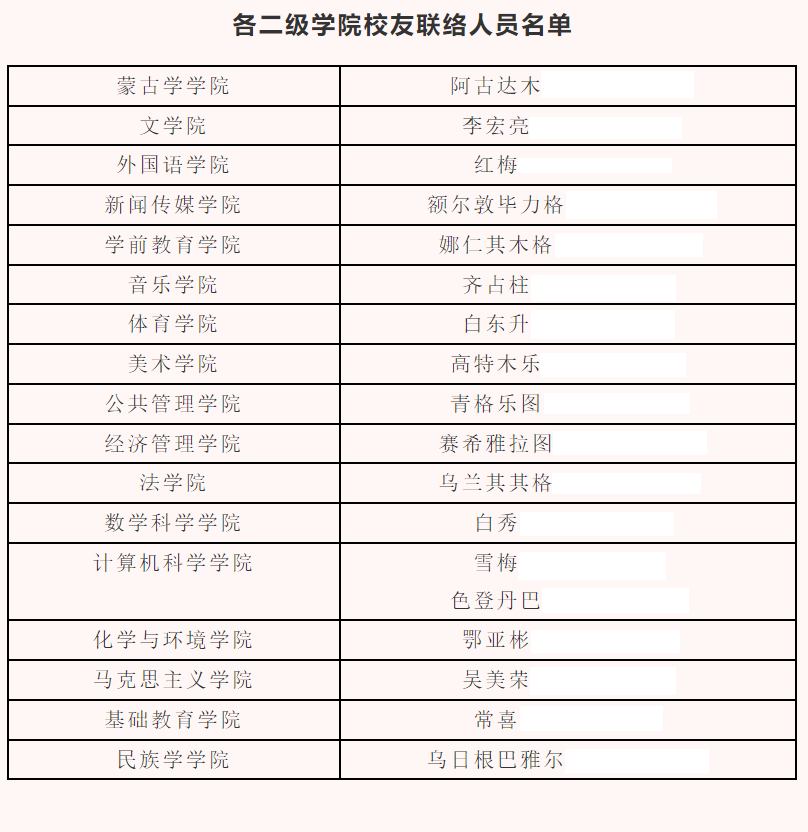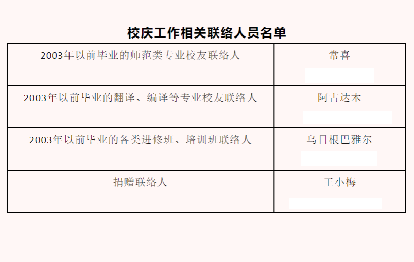 为进一步做好校友联络、捐赠等工作,现公布学校校庆工作相关联络人名单。