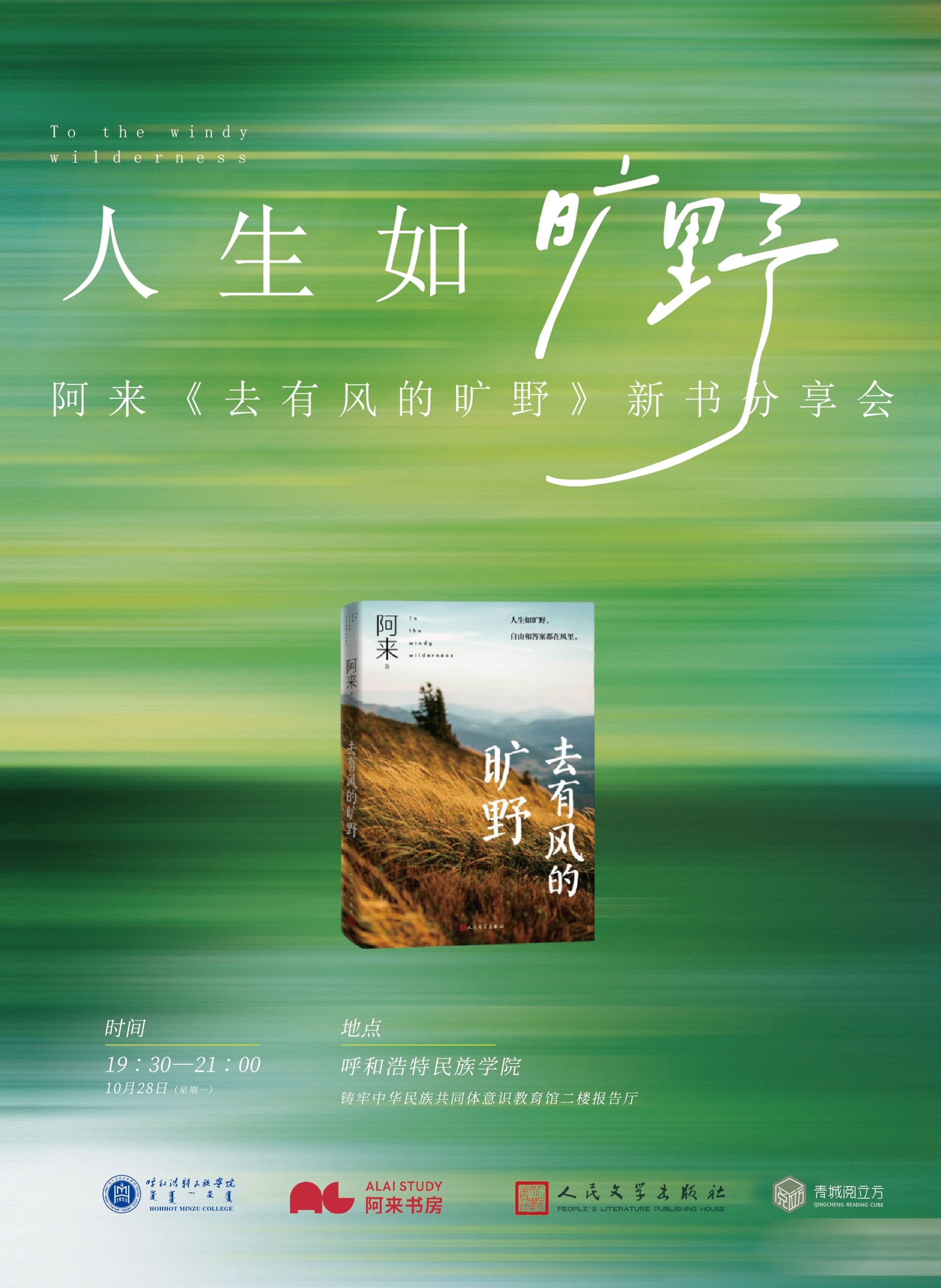 阿来:《去有风的旷野》新书分享会,10月28日(星期一)19:30—21:00。地点:铸牢中华民族共同体意识教育馆二楼报告厅。