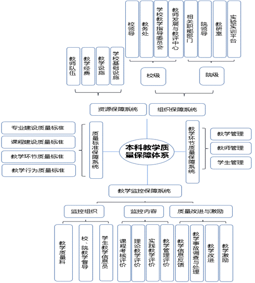 1.学校领导注意力在本科聚焦。校党委专题研究马克思主义学院标准化建设工作,党委书记指出“要提高政治站位抓发展、要对标对表抓发展、要展望未来抓发展”的要求,积极推进马克思主义学院高质量发展;在学校第五届教职工代表大会暨工会会员代表大会2022年年会上校长做《砥砺奋进 开拓创新 推动学校事业高质量发展》的大会报告,提出“加强思想政治教育、推进专业转型升级、深化教育教学改革”。2021-2022学年,学校召开院长、教学副院长工作会议21次、本科教学督导方面的调度会16次。学校以人才培养目标的有效达成为导向,以优质的条件资源和完善的组织制度为保障,建立了由资源保障系统、组织保障系统、质量标准保障系统、教学 监控保障系统、教学环节质量保障系统组成的本科教学质量保障体系。(详见图1)。