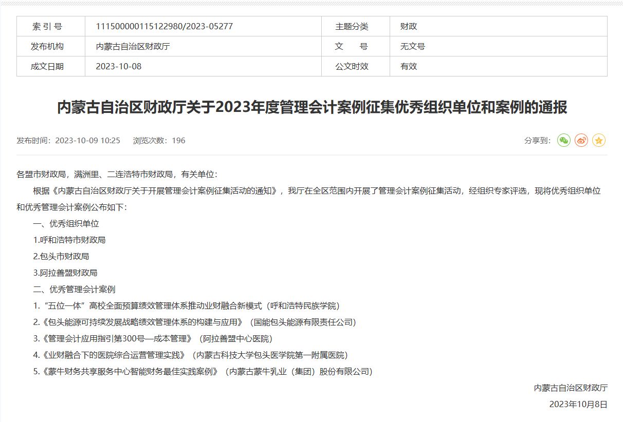 由内蒙古自治区财政厅开展的管理会计案例征集活动的结果日前揭晓,米乐官网财务处副处长徐多申报的案例《“五位一体”高校全面预算绩效管理体系推动业财融合新模式》,入选优秀管理会计案例,并位列第一。