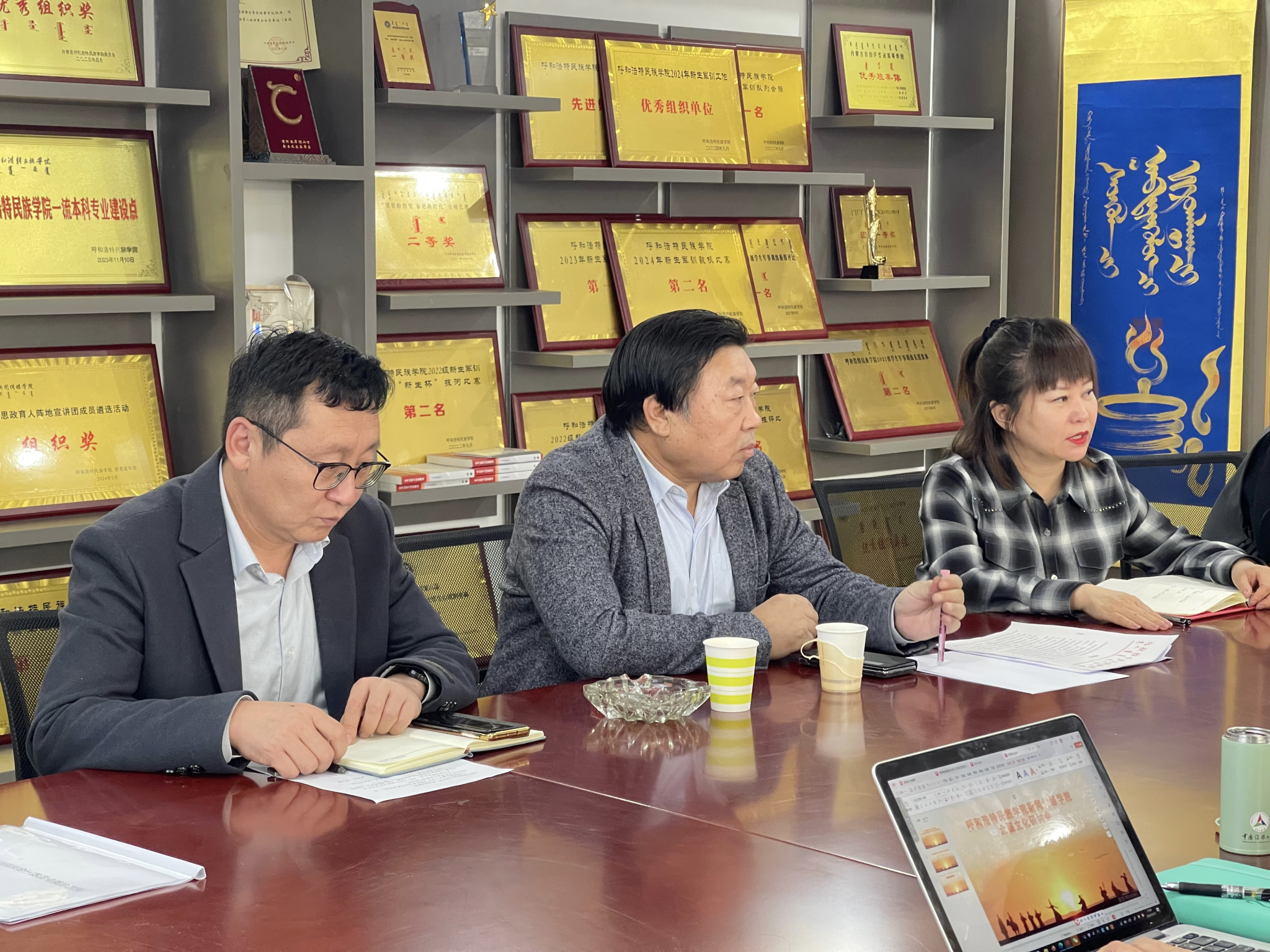 苏伦高娃向吴海龙阐述学院近期北疆文化传播实践工作成效,校地合作成果,下一步工作思路做法等。