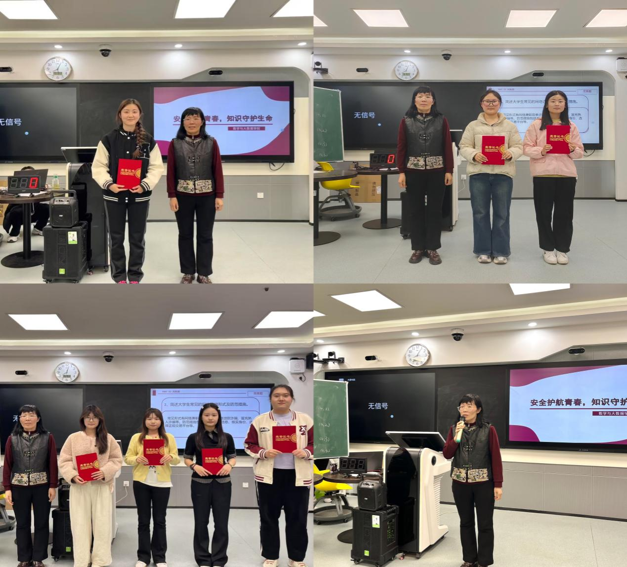 学生工作办公室主任刘爱春为获奖队伍颁发了荣誉证书、合影留念,并总结本次安全知识竞赛活动、强调了安全、健康的重要性,倡导同学们在日常生活中向身边的同学们广泛宣传安全防范常识,大家共同营造安全校园生活。