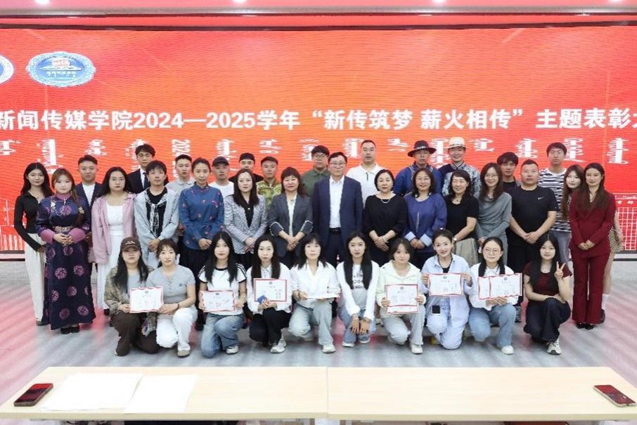 5月26日,新闻传媒学院“新传筑梦 薪火相传”主题表彰大会在北院图书馆一楼报告厅举行。新闻传媒学院党总支书记苏伦高娃、院长额尔敦毕力格、党总支副书记王丽、副院长安迎春,以及专业教师、班主任、辅导员、获奖学生代表共150余人参加。