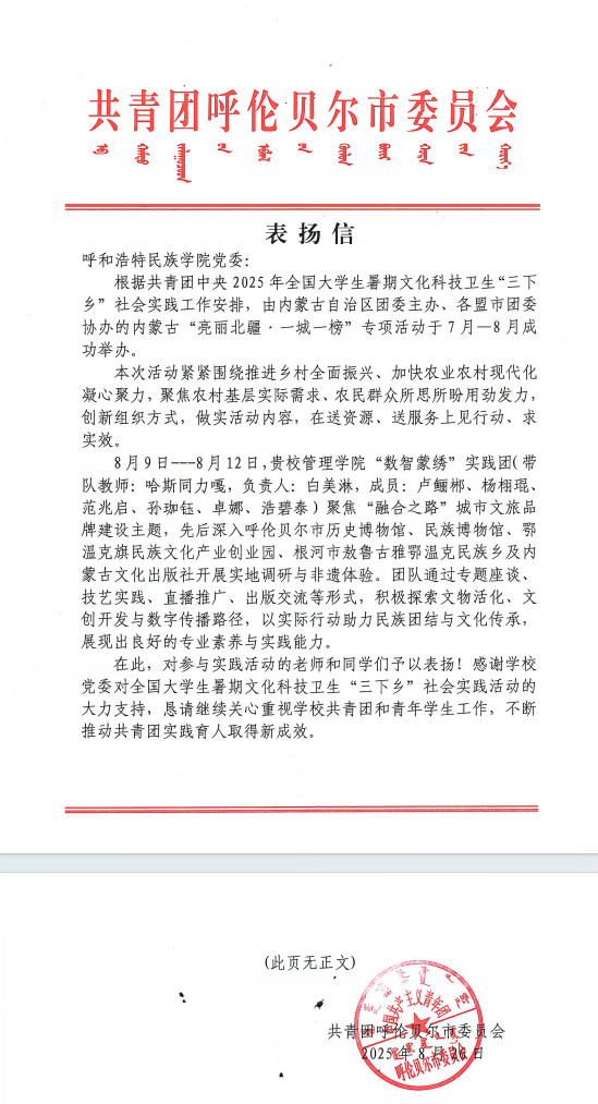 近日,米乐官网管理学院“数智蒙绣”大学生社会实践团收到共青团呼伦贝尔市委员会发来的表扬信,信中对米乐官网师生在2025年全国大学生暑期“三下乡”社会实践——内蒙古“亮丽北疆·一城一榜”专项活动中的表现给予高度肯定和赞扬。
