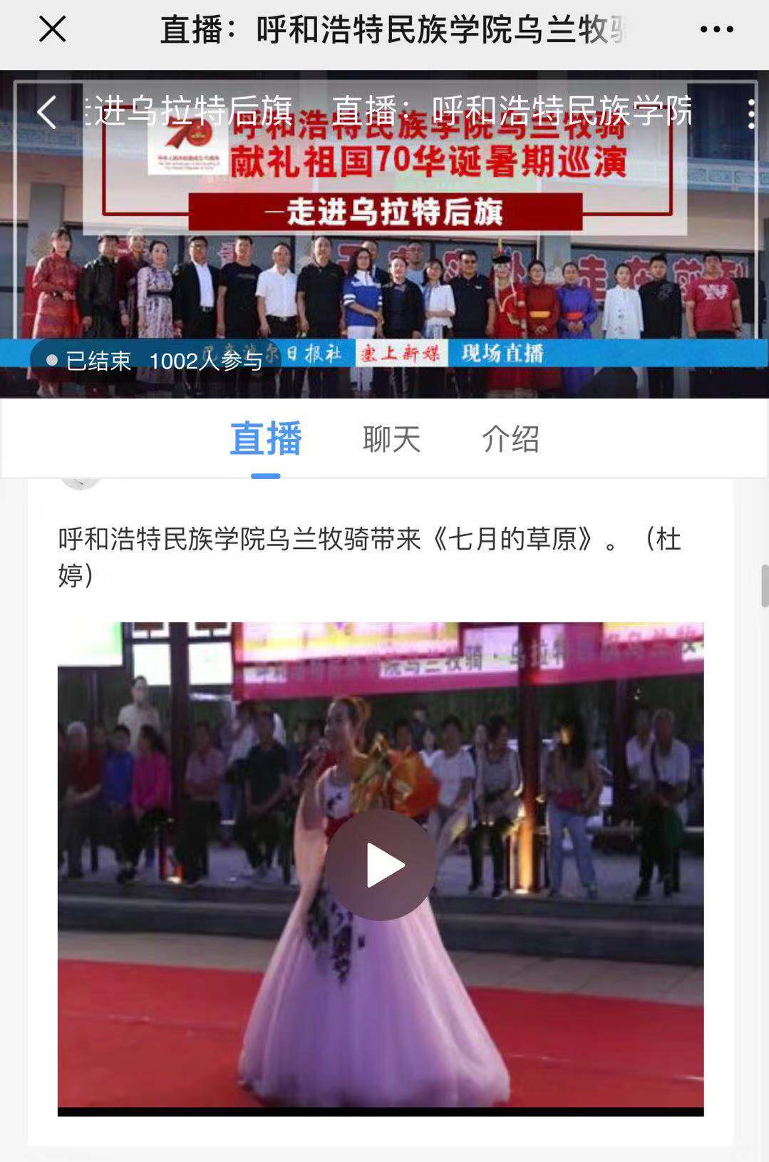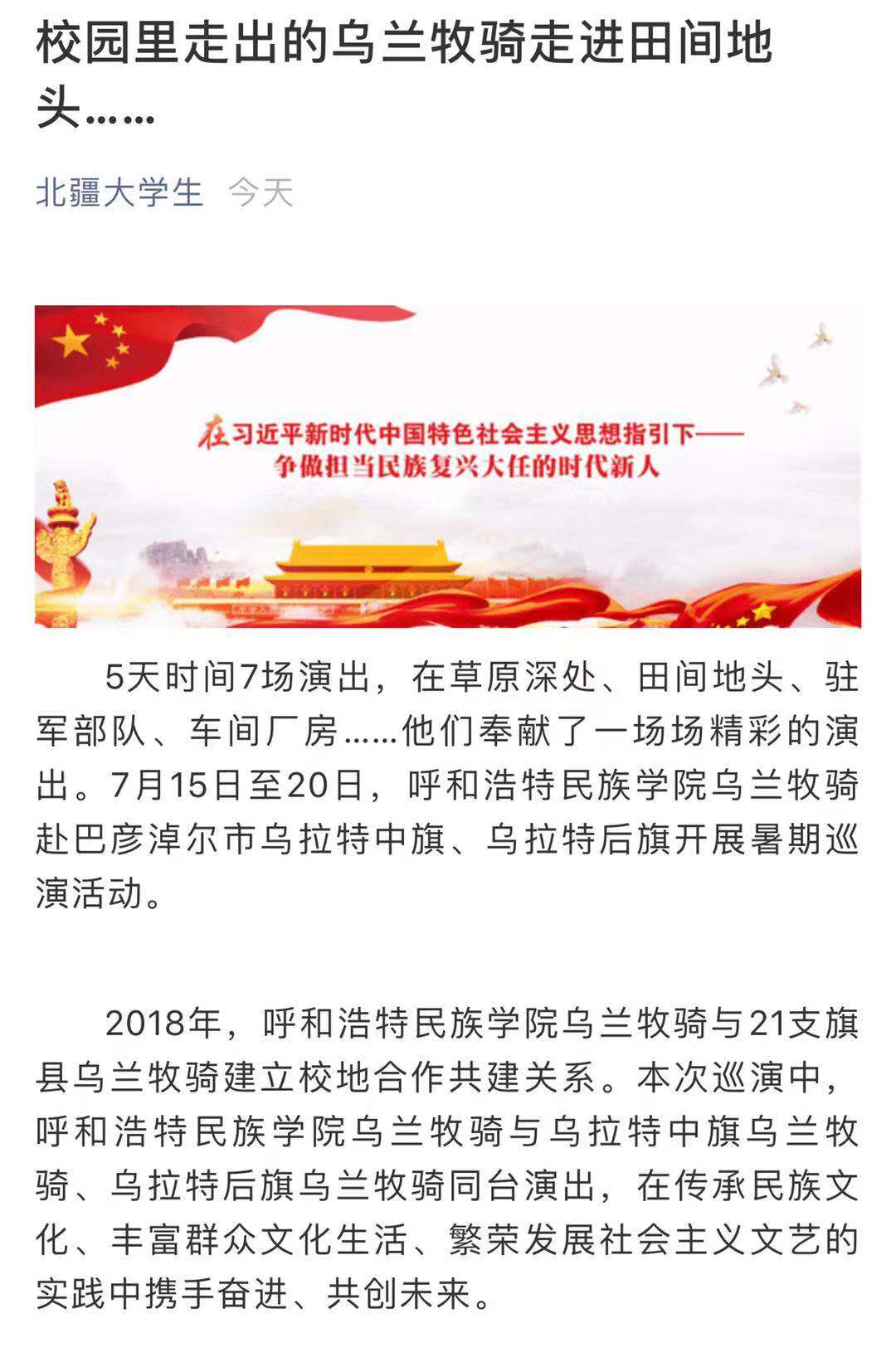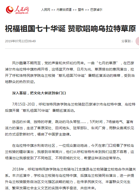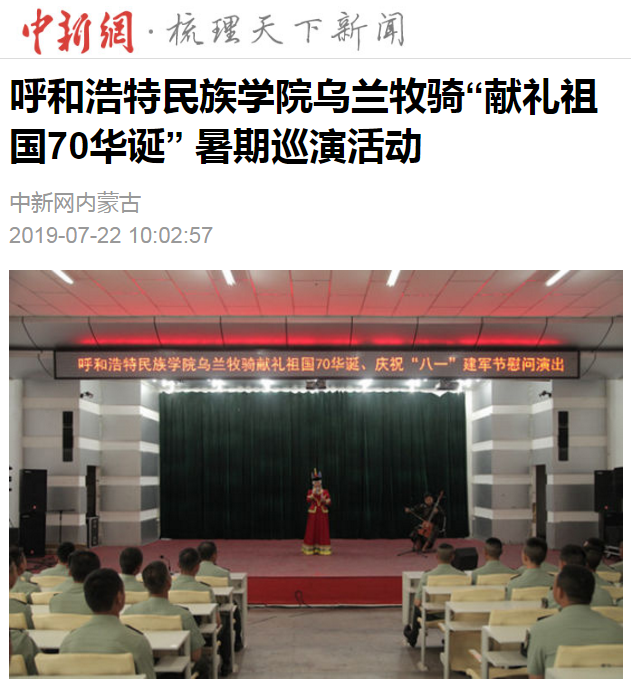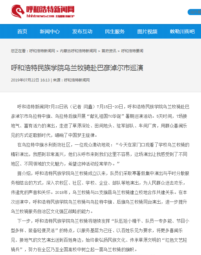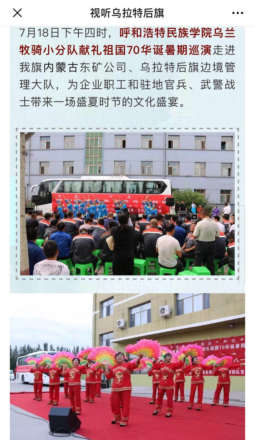 7月15日——20日,米乐官网乌兰牧骑赴巴彦淖尔深入农村、牧区、企业、军营、社区,开展“献礼祖国70华诞”暑期巡演活动。