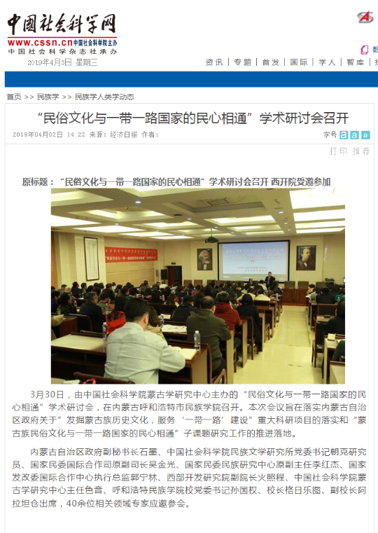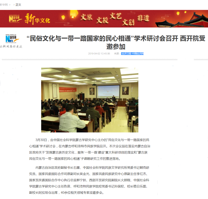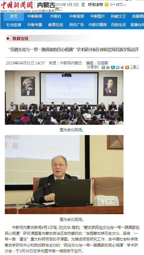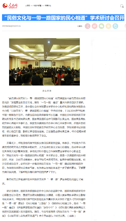 3月30日,“民俗文化与一带一路国家的民心相通”学术研讨会在米乐官网召开。经宣传部积极与媒体取得联系,人民网、中国新闻网、新华网、《民族画报》、中国社会科学网、内蒙古蒙古语卫视、内蒙古旅游报微信公众号等媒体进行了报道,取得了社会各界的广泛好评和关注。