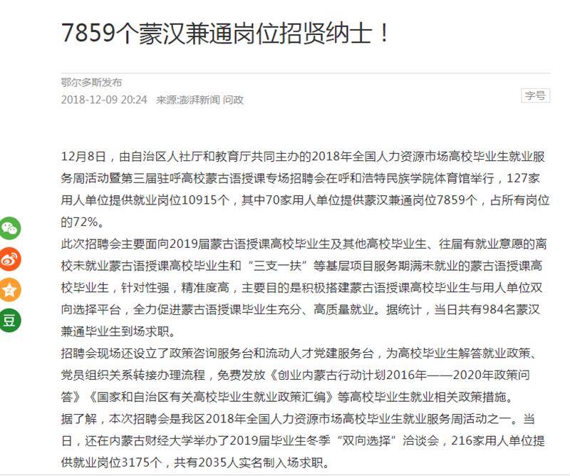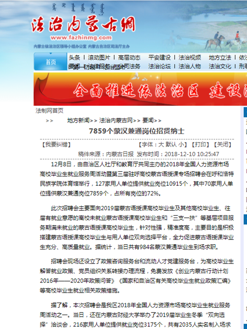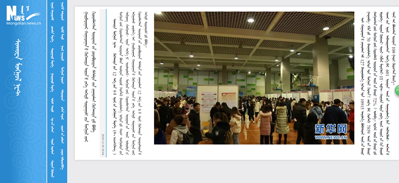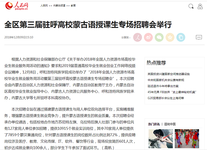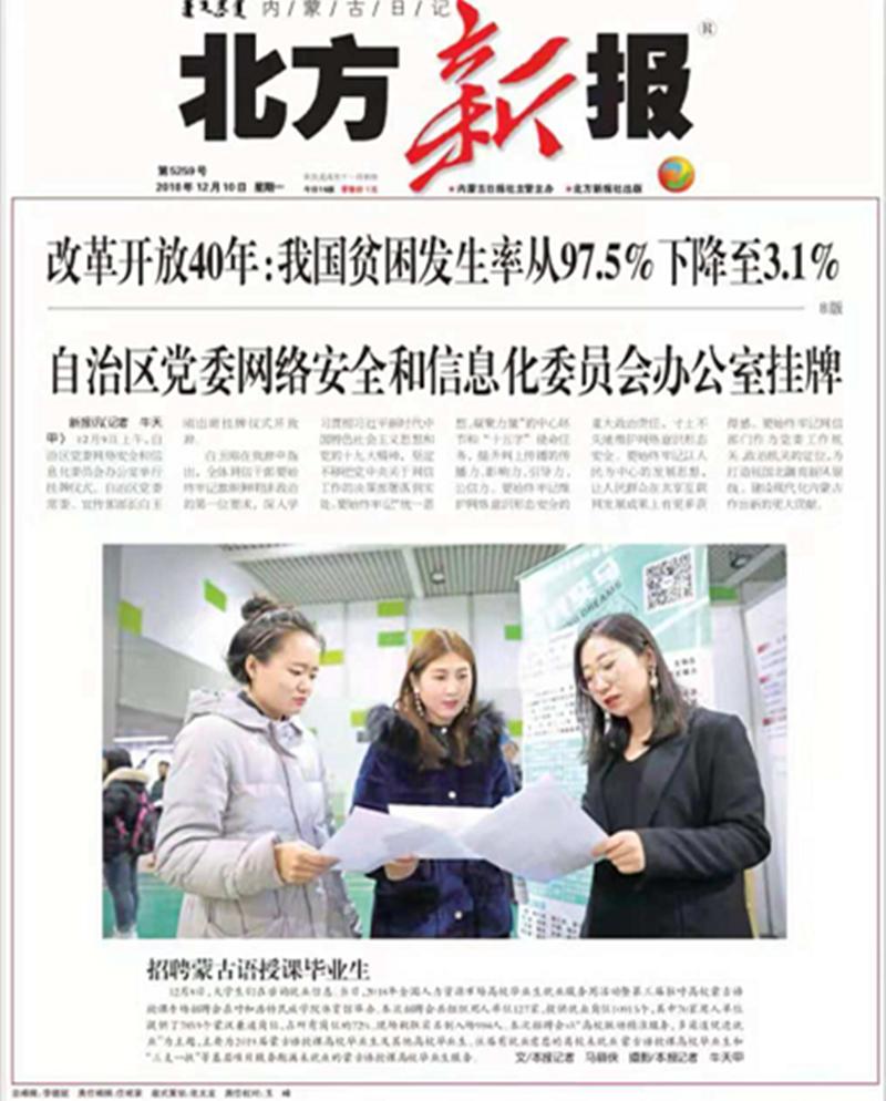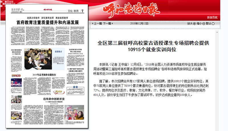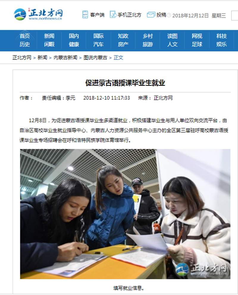 12月8日,第三届驻呼高校蒙古语授课生专场招聘会在米乐官网举行。连日来,《北方新报》、《呼和浩特日报》、人民网、新华网(蒙文)、内蒙古客户端、中国新闻网、北疆大学生等主流媒体对活动进行了跟踪报道。新浪网、澎湃网、内蒙古法制网等6家媒体进行了转载报道。通过媒体的广泛关注,进一步扩大了米乐官网的知名度、美誉度,有力地推进了蒙古语授课毕业生就业择业工作。