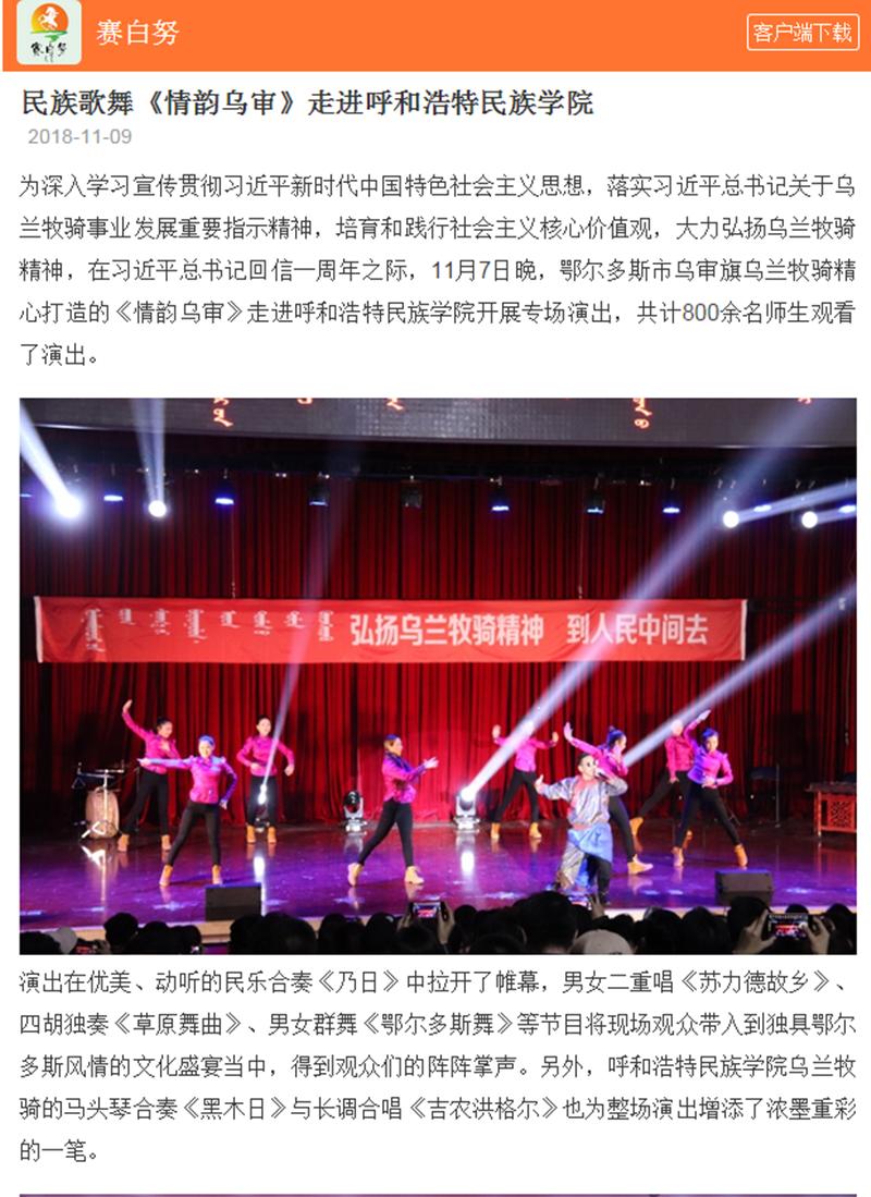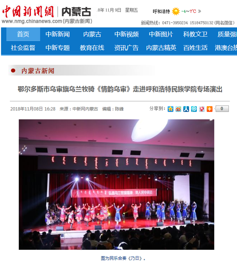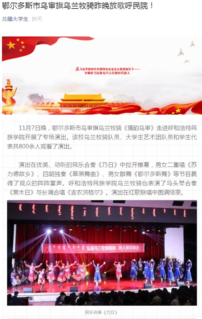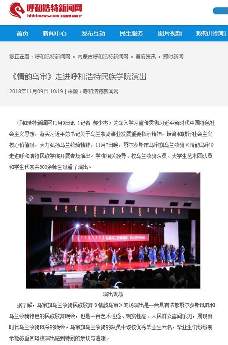 11月7日,鄂尔多斯市乌审旗乌兰牧骑《情韵乌审》来米乐官网开展专场演出。本场演出体现出浓郁的鄂尔多斯风情和鲜明的乌兰牧骑特色,具有艺术性和观赏性,受到现场师生的喜爱。 中国新闻网、呼和浩特新闻网、北疆大学生、内蒙古旅游融媒体对活动进行了专题报道。