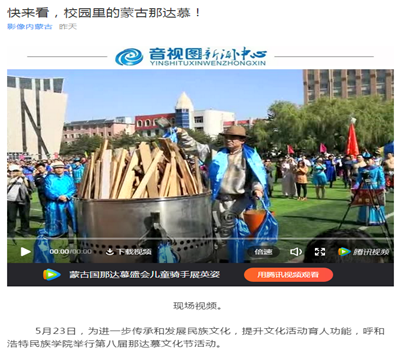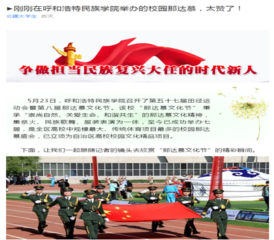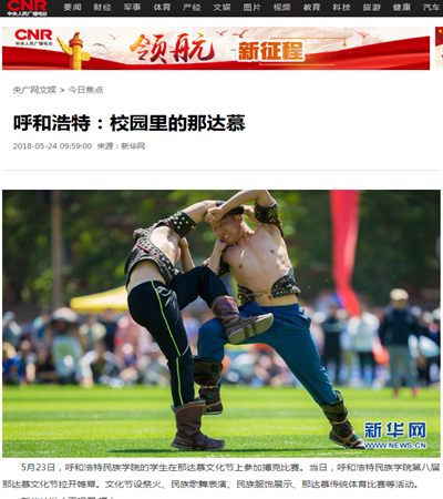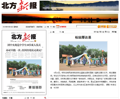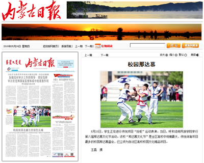 经学校党委宣传部的大力推广和团委、网络中心、保卫处、后勤管理处、体育系等部门的协助,本次那达慕文化节的媒体宣传工作实现了历史性突破。截止到5月28日,共有30家新闻媒体进行了专题报道,媒体覆盖广度和宣传报道力度是建校以来之最。其中,《中国日报》(英文名称《China Daily》,全球发行,期均90余万份)在显要位置以图片新闻报道;《中国青年报》《内蒙古日报》(蒙古语、汉语版)《呼和浩特日报》《北方新报》《呼和浩特晚报》《内蒙古晨报》7家报纸媒体进行了头版报道,《内蒙古日报》(蒙古语版)整版报道;内蒙古卫视2个电视频道,新华社、人民网、光明网、新华网、中国新闻网等11家网站,中央人民广播电台、中国蒙古语广播电台、内蒙古广播电台蒙古语频道、呼和浩特新闻广播等3家电台,影像内蒙古、北疆大学生、内蒙古客户端、内蒙古日报等4家主流微信公众号进了报道;新浪网、网易网、中国民族宗教网、《山西日报》等仅百余网站、媒体进行了转载报道。