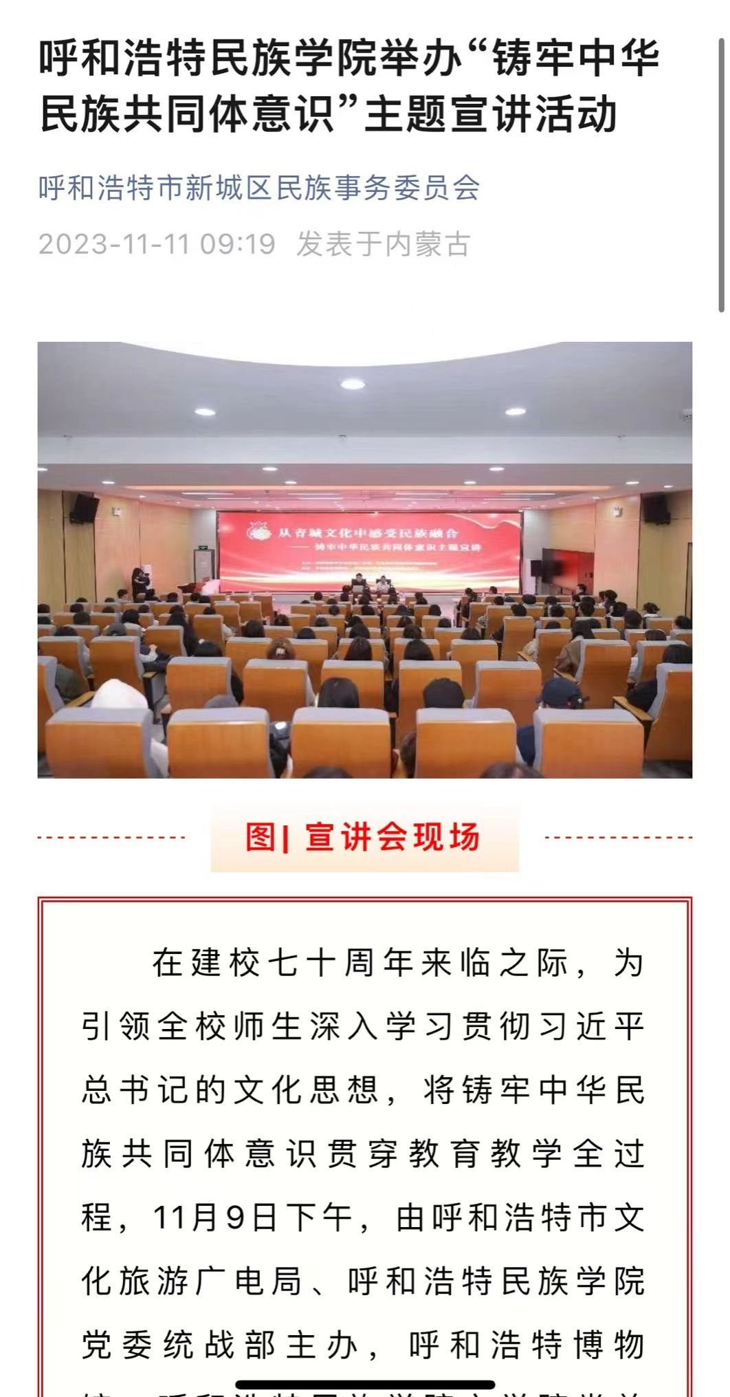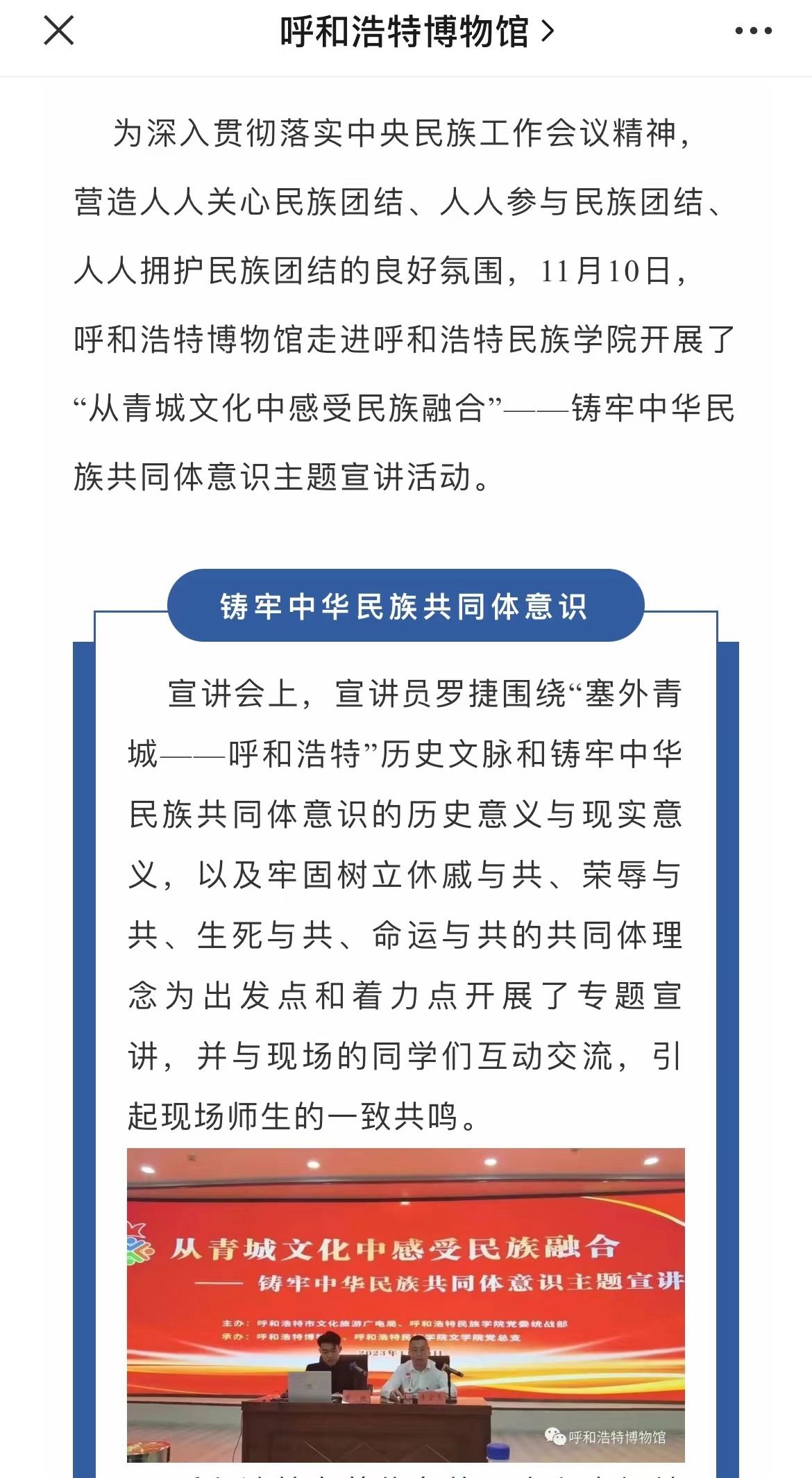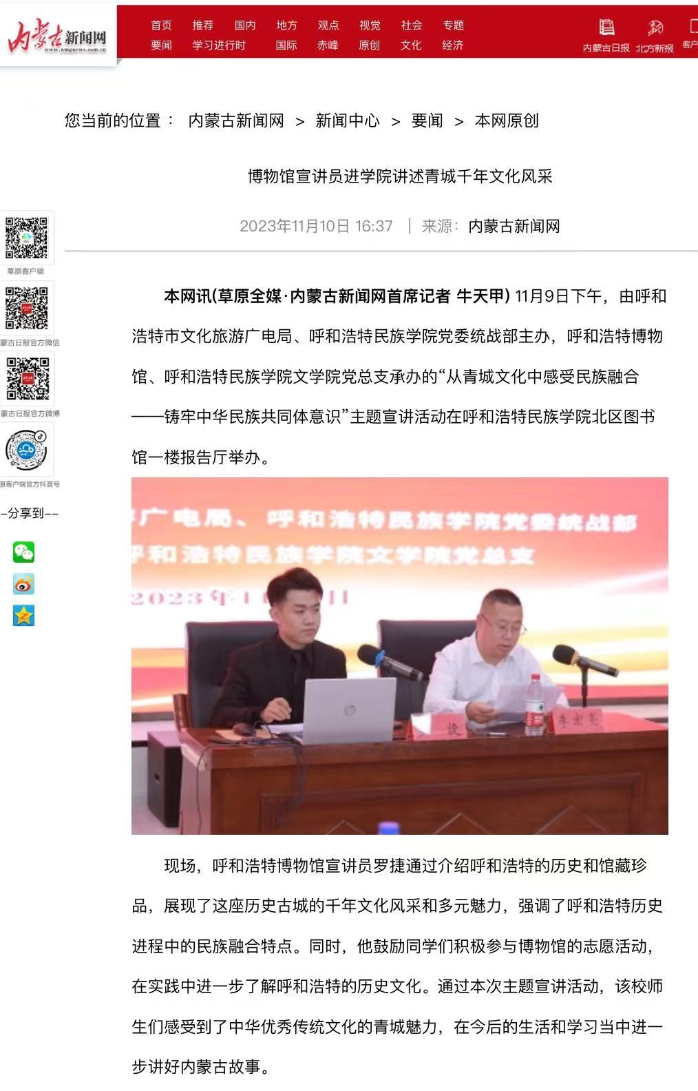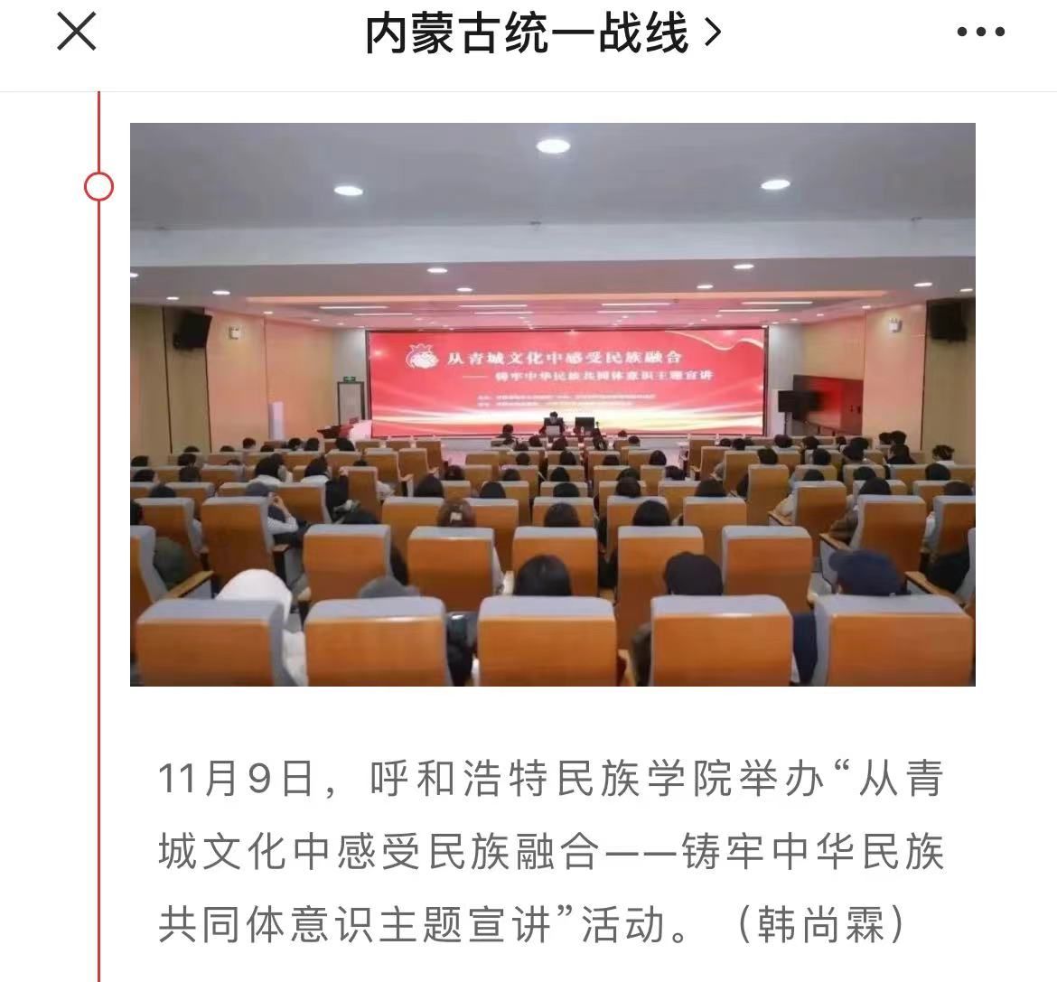 11月9日下午,由呼和浩特市文化旅游广电局、MILE米乐集团党委统战部主办,呼和浩特博物馆、MILE米乐集团文学院党总支承办的主题宣讲活动在北区图书馆一楼报告厅举办。活动受到社会各界的广泛关注和大力宣传。截至目前,共有中新网、内蒙古新闻网和内蒙古党委统战部官微、呼和浩特博物馆官微、呼和浩特新城区民族事务委员会官微等6家校外媒体对本次活动进行了宣传报道。