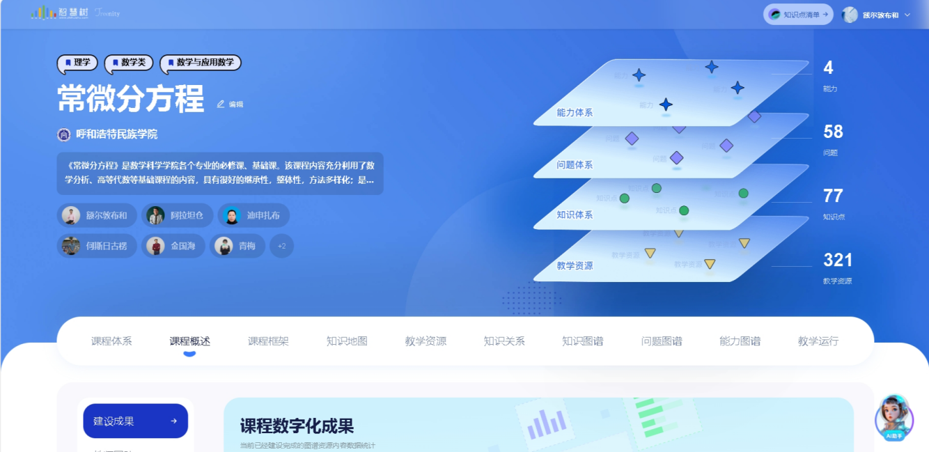 本课程为3学分,64学时。全课以方程为轴线,串起基础内容、应用案例和拓展知识。课程依托知识图谱,凝练77个知识点、嵌入挂载321个教学资源、链接知识关系88个、匹配422道测试题目、融入58个问题,增加了AI助手答疑功能。作为方程类课程,它与数学分析、高等代数、解析几何等先修课和数学物理方程、泛函分析、数学建模、微分几何、数值分析等后继课有着密切的关系,发挥着数学类专业知识体系的重要桥梁作用。