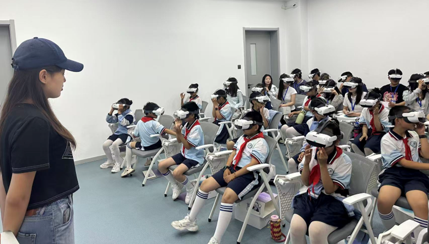 最后,同学们在志愿者的带领下,开启了新奇的参观体验之旅。来到了VR实训室,体验海底的世界,戴上VR设备后,同学们瞬间“潜入”神秘世界。大家纷纷发出惊叹,沉浸式感受科技带来的震撼。随后,同学们来到攀岩实训室。孩子们在志愿者的保护下,勇敢地向上攀爬,手脚并用,克服重重困难,感受运动带来的快乐。而在书法实训室则是另一番宁静而优雅的氛围。同学们拿起毛笔和粉笔,在志愿者的耐心指导下,学习基本的书法技巧。大家全神贯注,认真临摹。每一笔都饱含着对传统文化的热爱与敬意。