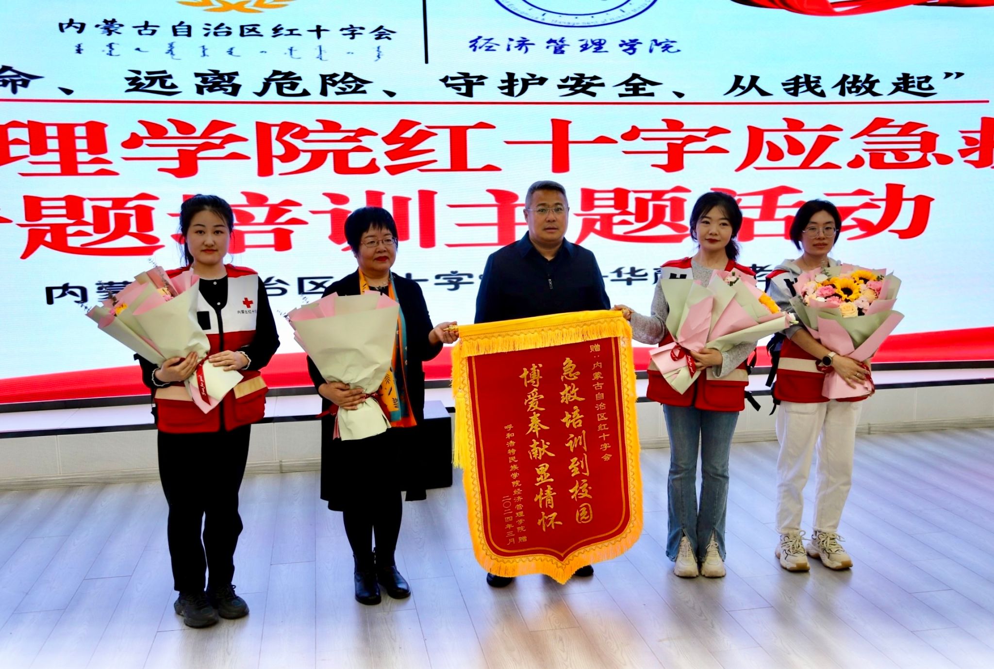 最后经济管理学院党总支书记周双喜同志为内蒙古红十字会授课的四位老师颁授锦旗,并向各位老师的到来表示热烈的欢迎和衷心的感谢。
