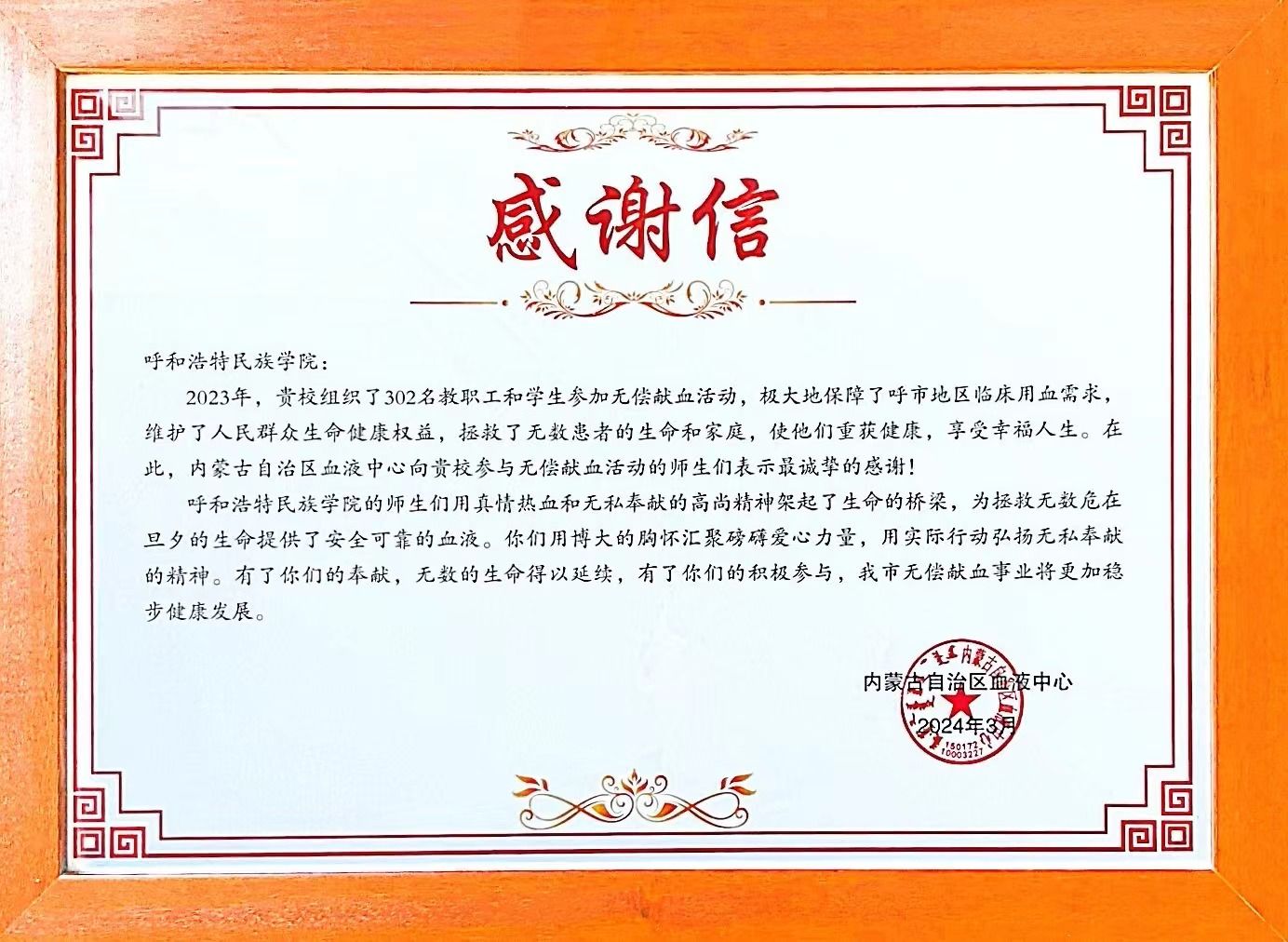 近日,自治区血液中心向米乐官网发来感谢信,向米乐官网广大师生学子对无偿献血事业的大力支持表示感谢。2023年,米乐官网教职工和学生进行了无偿献血,师生们用真情热血和无私奉献精神,架起生命桥梁,为呼和浩特市地区临床用血需求提供有力保障,维护了人民群众的生命健康。