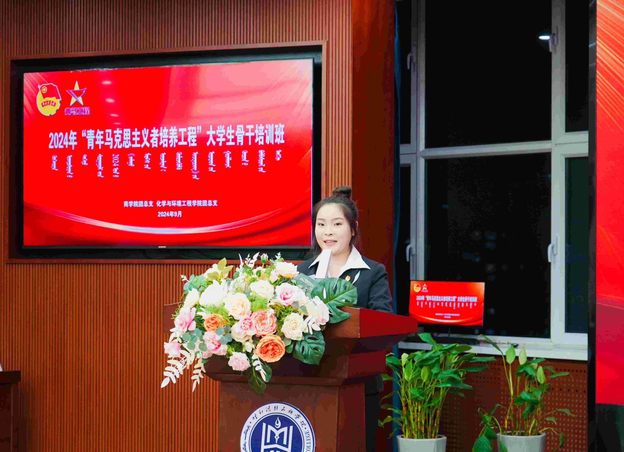 为深入学习贯彻落实党的二十届三中全会精神、习近平新时代中国特色社会主义思想、习近平总书记关于青年工作的重要思想,切实加强学生骨干队伍建设,着力培养信仰坚定、能力突出、素质优良、作风过硬的青年政治骨干,2024年9月26日,商学院与化学与环境工程学院联合开展2024年“青年马克思主义者培养工程”大学生骨干培训班,开班仪式在综合楼12楼报告厅举行,化学与环境工程学院党总支书记鄂亚彬、商学院党总支副书记李云、化学与环境工程学院党总支副书记乌玉娜、马克思主义学院副教授王玉红、团委组织部部长乌依勒斯、商学院团总支书记华国庆、化学与环境工程学院团总支书记瑙莫汗出席,各学院青马班培训学员、学生骨干和入团积极分子共120余人参加。