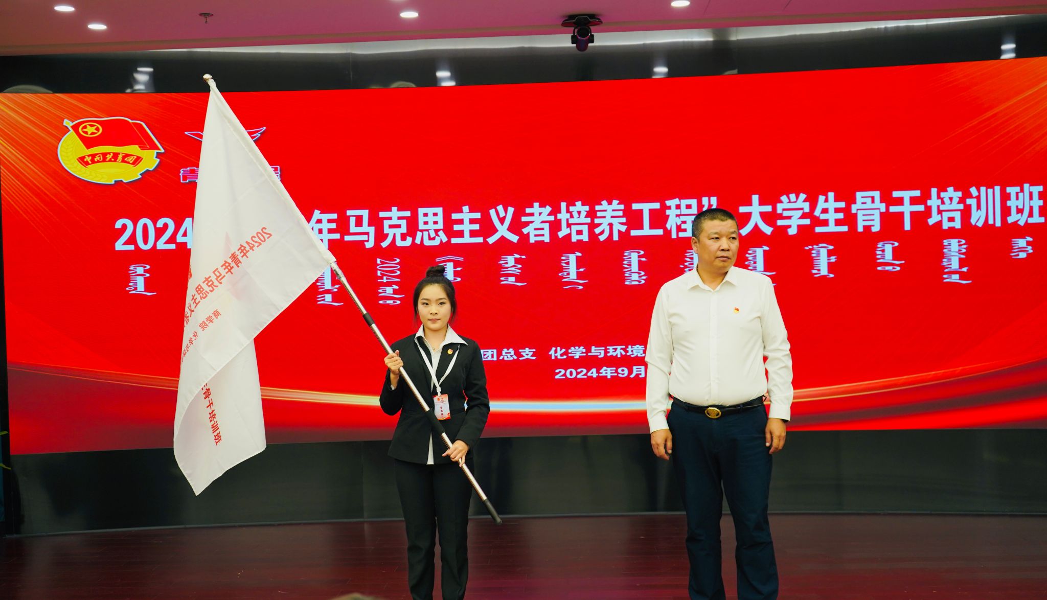 鄂亚彬书记致辞,他强调,大家要珍惜此次学习机会,高质量完成学习任务;要坚定理想信念,提升理论素养;要知行合一,做好模范表率。并为“青马班”授旗,学员代表郑璐璐接旗并发言。