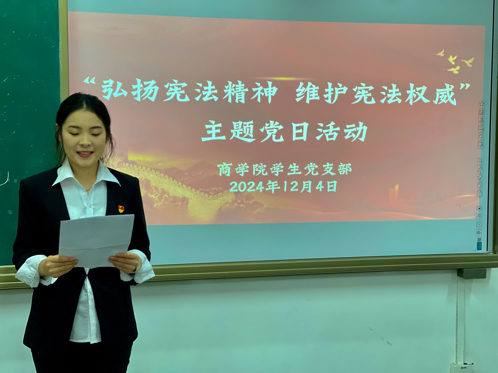 2024年12月4日是第十一个国家宪法日,为深入学习宣传贯彻习近平法治思想、进一步增强党员宪法意识,弘扬宪法精神,商学院学生党支部开展“弘扬宪法精神 维护宪法权威”主题党日活动,学院在校党员、发展对象、入党积极分子等50余人参加此次活动。