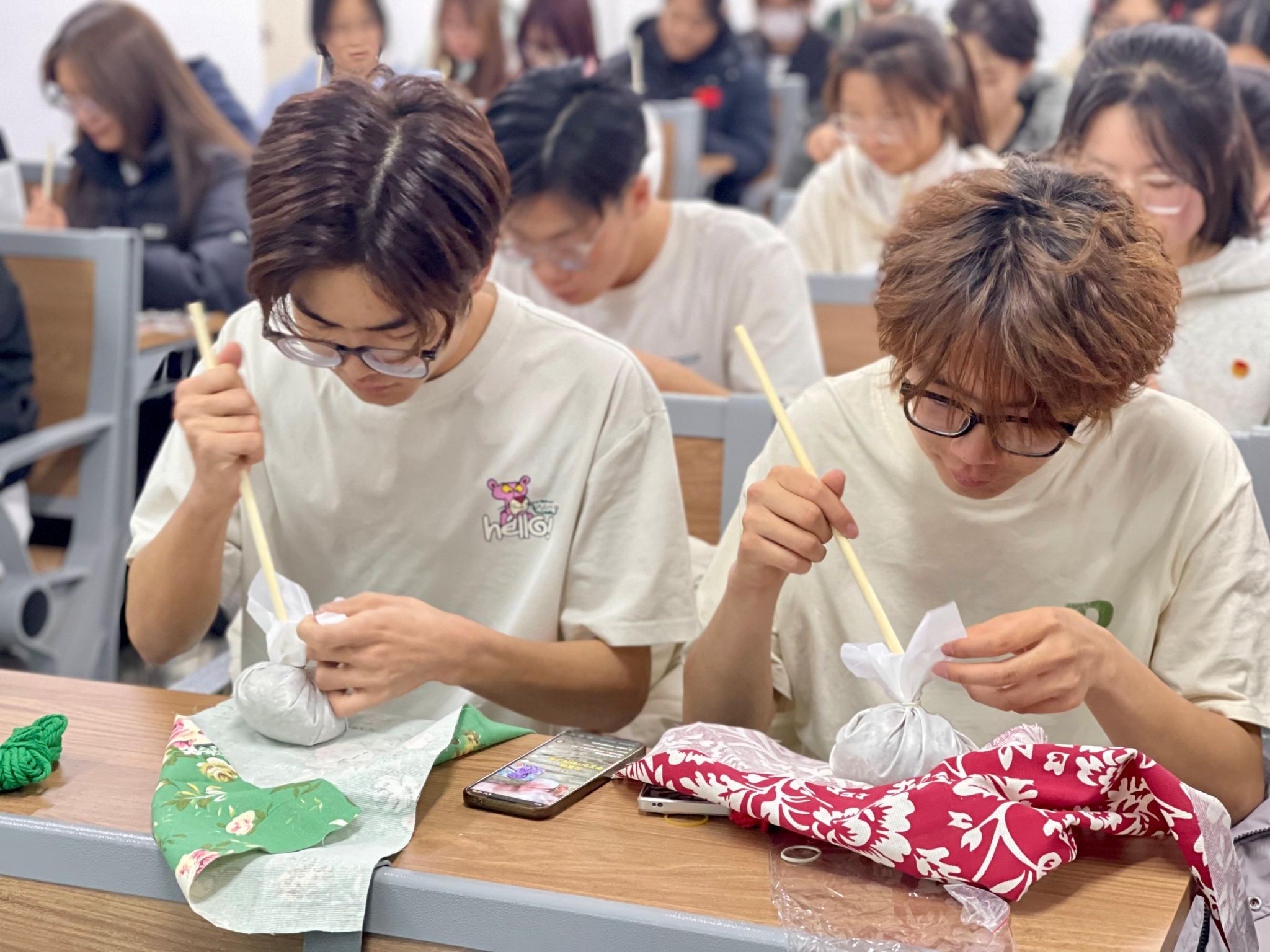 活动以"手作+文化"形式展开,学生代表首先讲解艾草锤的历史渊源与中医养生价值,现场演示选材、捆扎、编织等制作工艺。随后,参与者亲手挑选艾叶、棉花等天然材料,用棉布包裹成锤形,再以彩色棉线缠绕固定,完成兼具实用与装饰性的艾草锤作品。